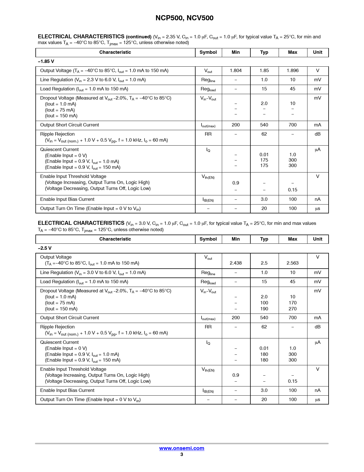 | Pages / Page | 18 / 3 — NCP500, NCV500. ELECTRICAL CHARACTERISTICS (continued). Characteristic. … |