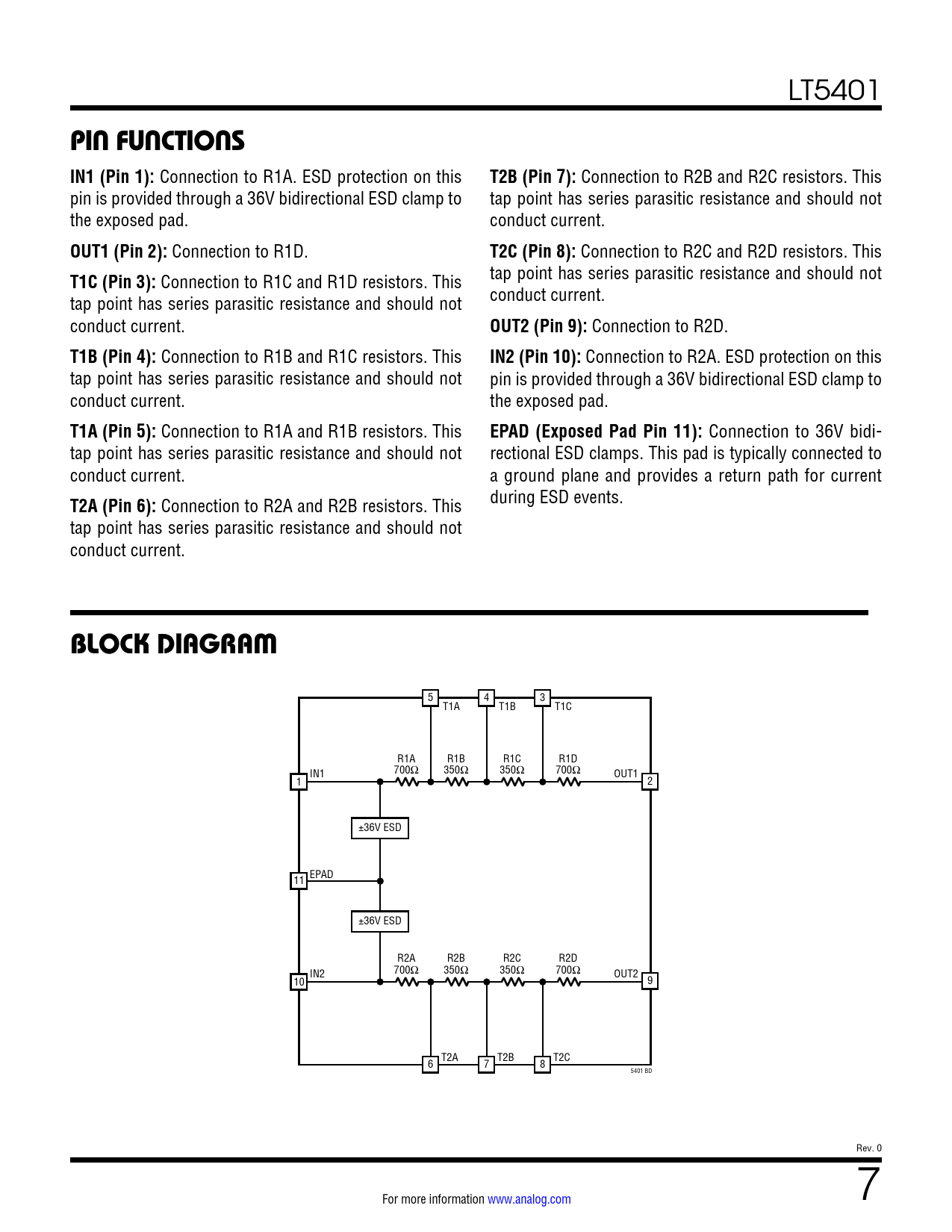 LT5401 PIN FUNCTIONS IN1 (Pin 1): Connection to R1A. ESD protection on this T2B (Pin 7): Connection to R2B and R2C resistors. This pin is provided through a 36V bidirectional ESD clamp to tap point has series parasitic resistance and should not the exposed pad. conduct current. OUT1 (Pin 2): Connection to R1D. T2C (Pin 8): Connection to R2C and R2D resistors. This T1C (Pin 3): Connection to R1C and R1D resistors. This tap point has series parasitic resistance and should not tap point has series parasitic resistance and should not conduct current. conduct current. OUT2 (Pin 9): Connection to R2D. T1B (Pin 4): Connection to R1B and R1C resistors. This IN2 (Pin 10): Connection to R2A. ESD protection on this tap point has series parasitic resistance and should not pin is provided through a 36V bidirectional ESD clamp to conduct current. the exposed pad. T1A (Pin 5): Connection to R1A and R1B resistors. This EPAD (Exposed Pad Pin 11): Connection to 36V bidi- tap point has series parasitic resistance and should not rectional ESD clamps. This pad is typically connected to conduct current. a ground plane and provides a return path for current T2A (Pin 6): Connection to R2A and R2B resistors. This during ESD events. tap point has series parasitic resistance and should not conduct current. BLOCK DIAGRAM 5 4 3 T1A T1B T1C R1A R1B R1C R1D IN1 700Ω 350Ω 350Ω 700Ω OUT1 1 2 ±36V ESD EPAD 11 ±36V ESD R2A R2B R2C R2D IN2 700Ω 350Ω 350Ω 700Ω OUT2 10 9 T2A T2B T2C 6 7 8 5401 BD Rev. 0 For more information www.analog.com 7 Document Outline Features Applications Typical Application Description Absolute Maximum Ratings Order Information Pin Configuration Electrical Characteristics Typical Performance Characteristics Pin Functions Block Diagram Applications Information Typical Applications Package Description Typical Application Related Parts