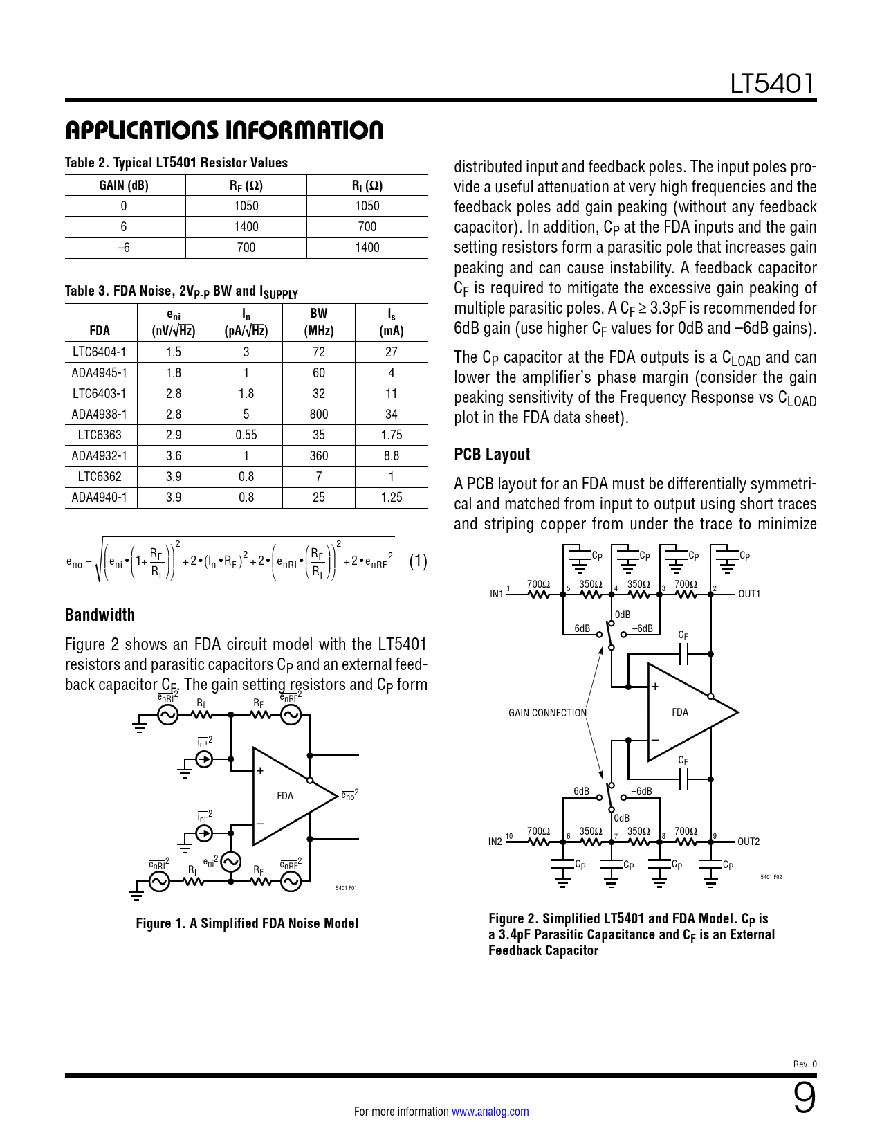APPLICATIONS INFORMATION Table 2. Typical LT5401 Resistor Values. GAIN (dB). RF (Ω). RI (Ω). Table 3. FDA Noise, 2V