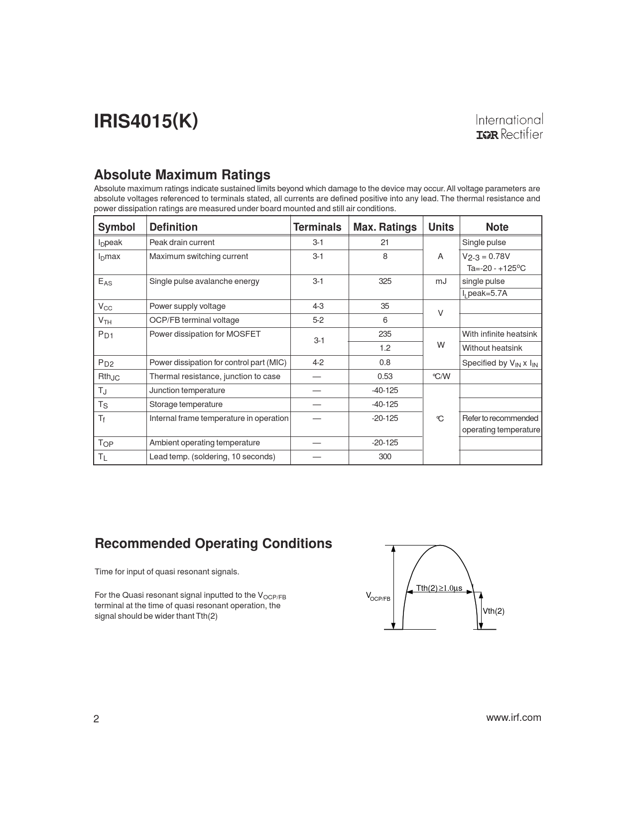 IRIS4015(K)Absolute Maximum Ratings Absolute maximum ratings indicate sustained limits beyond which damage to the device may occur. All voltage parameters are absolute voltages referenced to terminals stated, all currents are defined positive into any lead. The thermal resistance and power dissipation ratings are measured under board mounted and still air conditions. SymbolDefinitionTerminalsMax. RatingsUnitsNote IDpeak Peak drain current 3-1 21 Single pulse IDmax Maximum switching current 3-1 8 A V2-3 = 0.78V Ta=-20 - +125oC EAS Single pulse avalanche energy 3-1 325 mJ single pulse ILpeak=5.7A VCC Power supply voltage 4-3 35 V VTH OCP/FB terminal voltage 5-2 6 PD1 Power dissipation for MOSFET 235 With infinite heatsink 3-1 1.2 W Without heatsink PD2 Power dissipation for control part (MIC) 4-2 0.8 Specified by VIN x IIN RthJC Thermal resistance, junction to case — 0.53 °C/W TJ Junction temperature — -40-125 TS Storage temperature — -40-125 Tf Internal frame temperature in operation — -20-125 °C Refer to recommended operating temperature TOP Ambient operating temperature — -20-125 TL Lead temp. (soldering, 10 seconds) — 300 Recommended Operating Conditions Time for input of quasi resonant signals. Tth(2) s ≥1.0µ For the Quasi resonant signal inputted to the VOCP/FB VOCP/FB terminal at the time of quasi resonant operation, the Vth(2) signal should be wider thant Tth(2) 2 www.irf.com