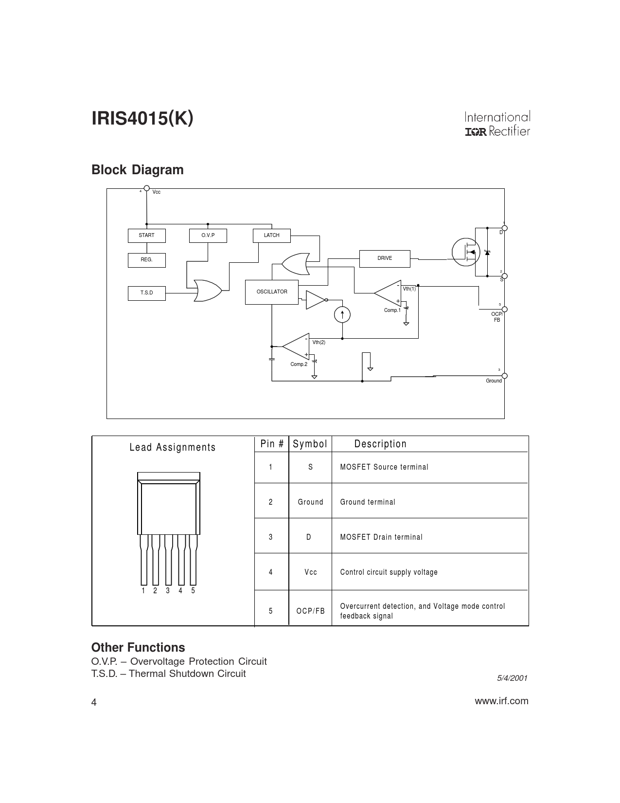IRIS4015(K)Block Diagram 4 Vcc 1 D START O.V.P LATCH DRIVE REG. 2 S - Vth(1) OSCILLATOR T.S.D + 5 Comp.1 OCP/ FB - Vth(2) + Comp.2 3 Ground Pin # S y m b o l Description L e a d A s s i g n m e n t s 1 S M O S F E T S o u r c e t e r m i n a l 2 G r o u n d Ground terminal 3 D M O S F E T D r a i n t e r m i n a l 4 V c c Control circuit supply voltage 1 2 3 4 5 Overcurrent detection, and Voltage mode control 5 O C P / F B feedback signal Other Functions O.V.P. – Overvoltage Protection Circuit T.S.D. – Thermal Shutdown Circuit 5/4/2001 4 www.irf.com