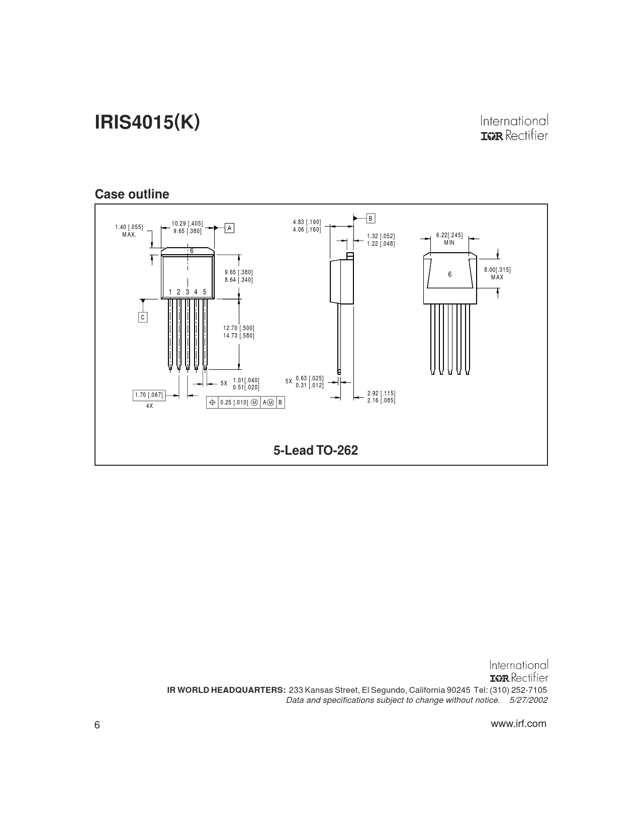 | Pages / Page | 6 / 6 — IRIS4015(K). Case outline. 5-Lead TO-262. IR WORLD HEADQUARTERS: |