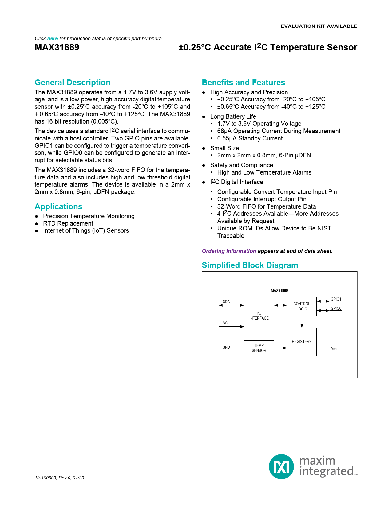 EVALUATION KIT AVAILABLE. here. MAX31889. ±0.25°C Accurate I2C Temperature Sensor. General Description. Benefits and Features