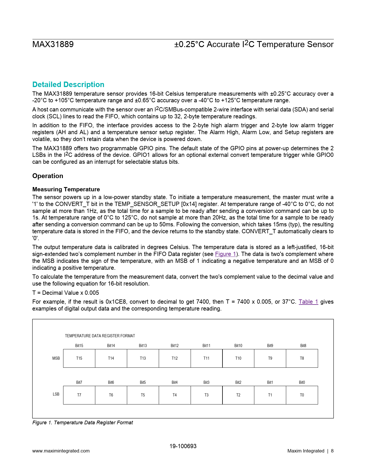 link to page 8 link to page 9 MAX31889 ±0.25°C Accurate I2C Temperature Sensor Detailed Description The MAX31889 temperature sensor provides 16-bit Celsius temperature measurements with ±0.25°C accuracy over a -20°C to +105°C temperature range and ±0.65°C accuracy over a -40°C to +125°C temperature range. A host can communicate with the sensor over an I2C/SMBus-compatible 2-wire interface with serial data (SDA) and serial clock (SCL) lines to read the FIFO, which contains up to 32, 2-byte temperature readings. In addition to the FIFO, the interface provides access to the 2-byte high alarm trigger and 2-byte low alarm trigger registers (AH and AL) and a temperature sensor setup register. The Alarm High, Alarm Low, and Setup registers are volatile, so they don’t retain data when the device is powered down. The MAX31889 offers two programmable GPIO pins. The default state of the GPIO pins at power-up determines the 2 LSBs in the I2C address of the device. GPIO1 allows for an optional external convert temperature trigger while GPIO0 can be configured as an interrupt for selectable status bits. OperationMeasuring Temperature The sensor powers up in a low-power standby state. To initiate a temperature measurement, the master must write a '1' to the CONVERT_T bit in the TEMP_SENSOR_SETUP [0x14] register. At temperature range of -40°C to 0°C, do not sample at more than 1Hz, as the total time for a sample to be ready after sending a conversion command can be up to 1s. At temperature range of 0°C to 125°C, do not sample at more than 20Hz, as the total time for a sample to be ready after sending a conversion command can be up to 50ms. Following the conversion, which takes 15ms (typ), the resulting temperature data is stored in the FIFO, and the device returns to the standby state. CONVERT_T automatically clears to '0'. The output temperature data is calibrated in degrees Celsius. The temperature data is stored as a left-justified, 16-bit sign-extended two’s complement number in the FIFO Data register (see Figure 1). The data is two's complement where the MSB indicates the sign of the temperature, with an MSB of 1 indicating a negative temperature and an MSB of 0 indicating a positive temperature. To calculate the temperature from the measurement data, convert the two's complement value to the decimal value and use the following equation for 16-bit resolution. T = Decimal Value x 0.005 For example, if the result is 0x1CE8, convert to decimal to get 7400, then T = 7400 x 0.005, or 37°C. Table 1 gives examples of digital output data and the corresponding temperature reading. TEMPERATURE DATA REGISTER FORMAT Bit15 Bit14 Bit13 Bit12 Bit11 Bit10 Bit9 Bit8 MSB T15 T14 T13 T12 T11 T10 T9 T8 Bit7 Bit6 Bit5 Bit4 Bit3 Bit2 Bit1 Bit0 LSB T7 T6 T5 T4 T3 T2 T1 T0 Figure 1. Temperature Data Register Format 19-100693 www.maximintegrated.com Maxim Integrated | 8 Document Outline General Description Applications Benefits and Features Simplified Block Diagram Absolute Maximum Ratings Package Information μDFN Electrical Characteristics Electrical Characteristics (continued) Typical Operating Characteristics Typical Operating Characteristics (continued) Pin Configuration μDFN Pin Description Functional Diagrams Detailed Description Operation Measuring Temperature Alarm Signaling GPIO I2C I2C Slave Address I2C/SMBus Compatible Serial Interface Detailed I2C Timing Diagram Bit Transfer START and STOP Conditions Early STOP Conditions Acknowledge Bit I2C Write Data Format I2C Read Data Format FIFO Description Register Map Register Map Register Details STATUS (0x0) INTERRUPT ENABLE (0x1) FIFO WRITE POINTER (0x04) FIFO READ POINTER (0x05) FIFO OVERFLOW COUNTER (0x06) FIFO DATA COUNTER (0x07) FIFO DATA (0x08) FIFO CONFIGURATION 1 (0x09) FIFO CONFIGURATION 2 (0x0A) SYSTEM CONTROL (0x0C) ALARM HIGH MSB (0x10) ALARM HIGH LSB (0x11) ALARM LOW MSB (0x12) ALARM LOW LSB (0x13) TEMP SENSOR SETUP (0x14) GPIO SETUP (0x20) GPIO CONTROL (0x21) ROM ID 1 (0x31) ROM ID 2 (0x32) ROM ID 3 (0x33) ROM ID 4 (0x34) ROM ID 5 (0x35) ROM ID 6 (0x36) PART IDENTIFIER (0xFF) Applications Information Measurement Considerations Typical Application Circuit Ordering Information Revision History