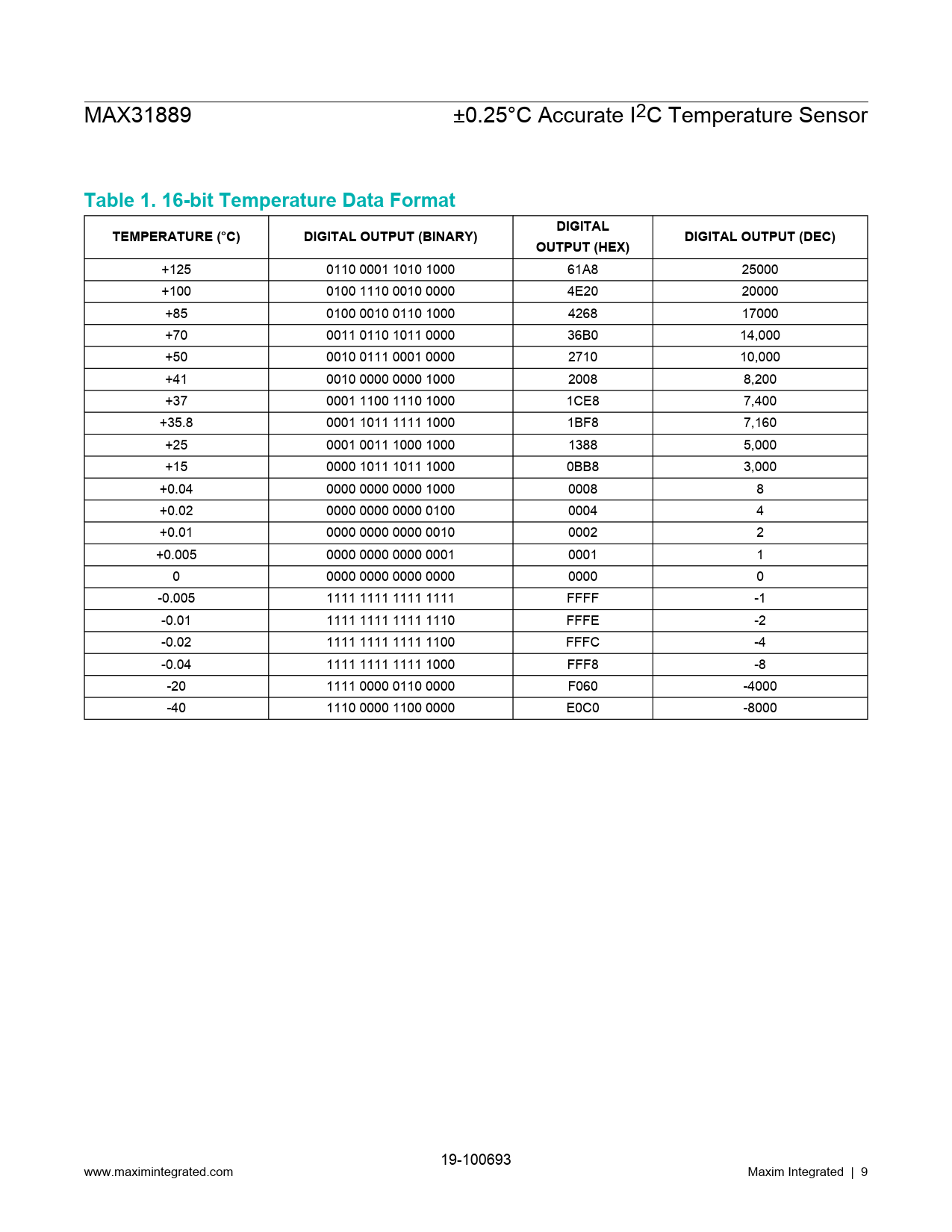 Table 1. 16-bit Temperature Data Format DIGITAL TEMPERATURE (°C) DIGITAL OUTPUT (BINARY) DIGITAL OUTPUT (DEC) OUTPUT (HEX)