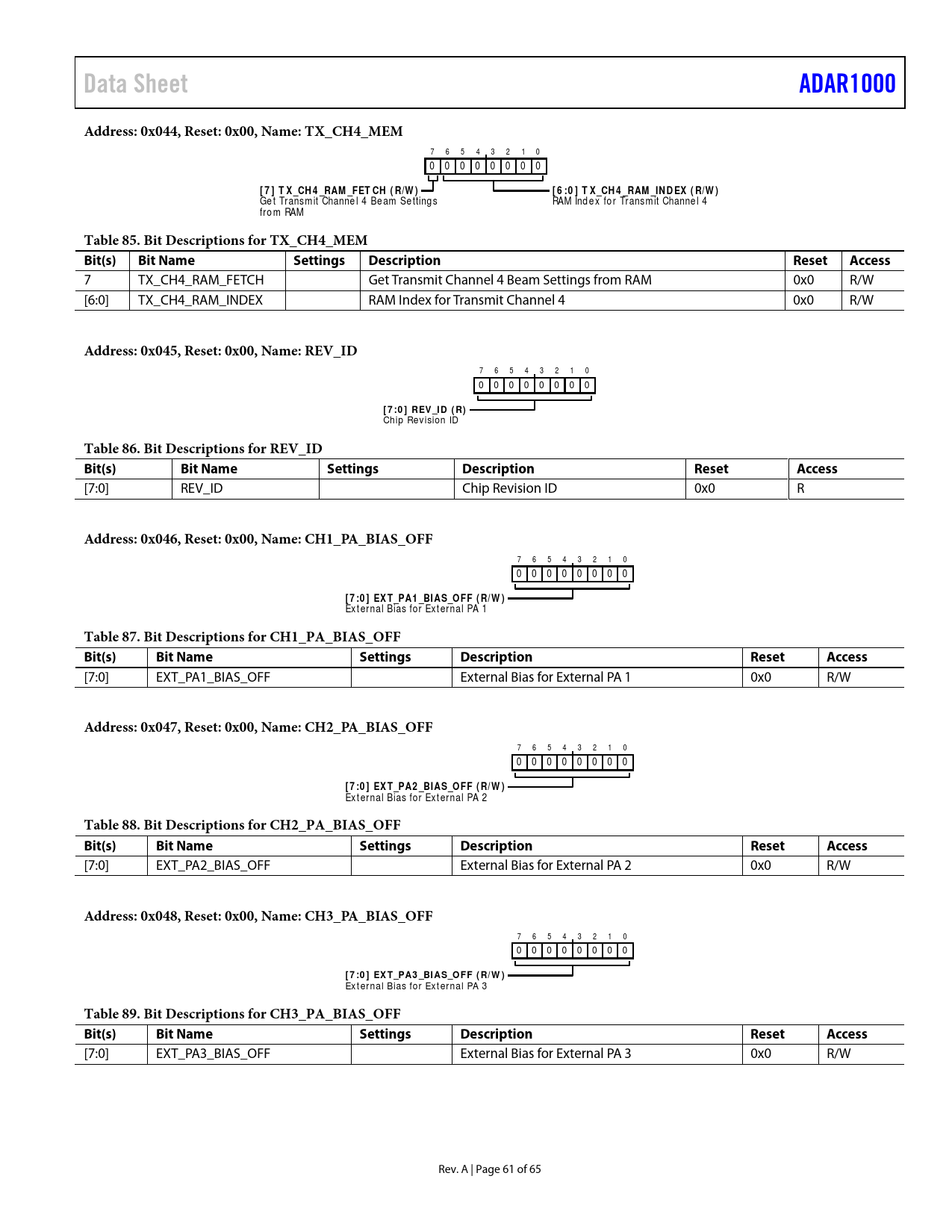 Data SheetADAR1000Address: 0x044, Reset: 0x00, Name: TX_CH4_MEM 7 6 5 4 3 2 1 0 0 0 0 0 0 0 0 0 [ 7 ] T X _CH 4 _RAM _FET CH ( R/W )[ 6 :0 ] T X _CH 4 _RAM _IN D EX ( R/W ) Ge t Trans m it Channe l 4 Be am Se tting s RAM Ind e x fo r Trans m it Channe l 4 fro m RAM Table 85. Bit Descriptions for TX_CH4_MEM Bit(s)Bit NameSettingsDescriptionResetAccess 7 TX_CH4_RAM_FETCH Get Transmit Channel 4 Beam Settings from RAM 0x0 R/W [6:0] TX_CH4_RAM_INDEX RAM Index for Transmit Channel 4 0x0 R/W Address: 0x045, Reset: 0x00, Name: REV_ID 7 6 5 4 3 2 1 0 0 0 0 0 0 0 0 0 [ 7 :0 ] REV _I D ( R) Chip Rev ision ID Table 86. Bit Descriptions for REV_ID Bit(s)Bit NameSettingsDescriptionResetAccess [7:0] REV_ID Chip Revision ID 0x0 R Address: 0x046, Reset: 0x00, Name: CH1_PA_BIAS_OFF 7 6 5 4 3 2 1 0 0 0 0 0 0 0 0 0 [ 7 :0 ] EX T_PA1 _BI AS_OFF ( R/W ) Ex t ernal Bias for Ex t ernal PA 1 Table 87. Bit Descriptions for CH1_PA_BIAS_OFF Bit(s)Bit NameSettingsDescriptionResetAccess [7:0] EXT_PA1_BIAS_OFF External Bias for External PA 1 0x0 R/W Address: 0x047, Reset: 0x00, Name: CH2_PA_BIAS_OFF 7 6 5 4 3 2 1 0 0 0 0 0 0 0 0 0 [ 7 :0 ] EX T_PA2 _BI AS_OFF ( R/W ) Ex t ernal Bias for Ex t ernal PA 2 Table 88. Bit Descriptions for CH2_PA_BIAS_OFF Bit(s)Bit NameSettingsDescriptionResetAccess [7:0] EXT_PA2_BIAS_OFF External Bias for External PA 2 0x0 R/W Address: 0x048, Reset: 0x00, Name: CH3_PA_BIAS_OFF 7 6 5 4 3 2 1 0 0 0 0 0 0 0 0 0 [ 7 :0 ] EX T_PA3 _BI AS_OFF ( R/W ) Ex t ernal Bias for Ex t ernal PA 3 Table 89. Bit Descriptions for CH3_PA_BIAS_OFF Bit(s)Bit NameSettingsDescriptionResetAccess [7:0] EXT_PA3_BIAS_OFF External Bias for External PA 3 0x0 R/W Rev. A | Page 61 of 65 Document Outline Features Applications General Description Functional Block Diagram Revision History Specifications Timing Specifications Timing Diagrams SPI Block Write Mode SPI Write All Mode Absolute Maximum Ratings Thermal Resistance ESD Caution Pin Configuration and Function Descriptions Typical Performance Characteristics Theory of Operation RF Path Phase and Gain Control Power Detectors External Amplifier Bias DACs External Switch Control Transmit and Receive Control RF Subcircuit Bias Control and Enables ADC Operation Chip Addressing Memory Access Calibration Applications Information Gain Control Registers Switched Attenuator Control Phase Control Registers Transmit and Receive Subcircuit Control TR_SOURCE = 1 (TR Pin Control) TR_SOURCE = 0 (SPI Control) Transmit and Receive Switch Driver Control PA Bias Output Control LNA Bias Output Control Transmit/Receive Delay Control Transmit and Receive Mode Switching SPI Programming Example Powering the ADAR1000 Register Map Register Descriptions Outline Dimensions Ordering Guide