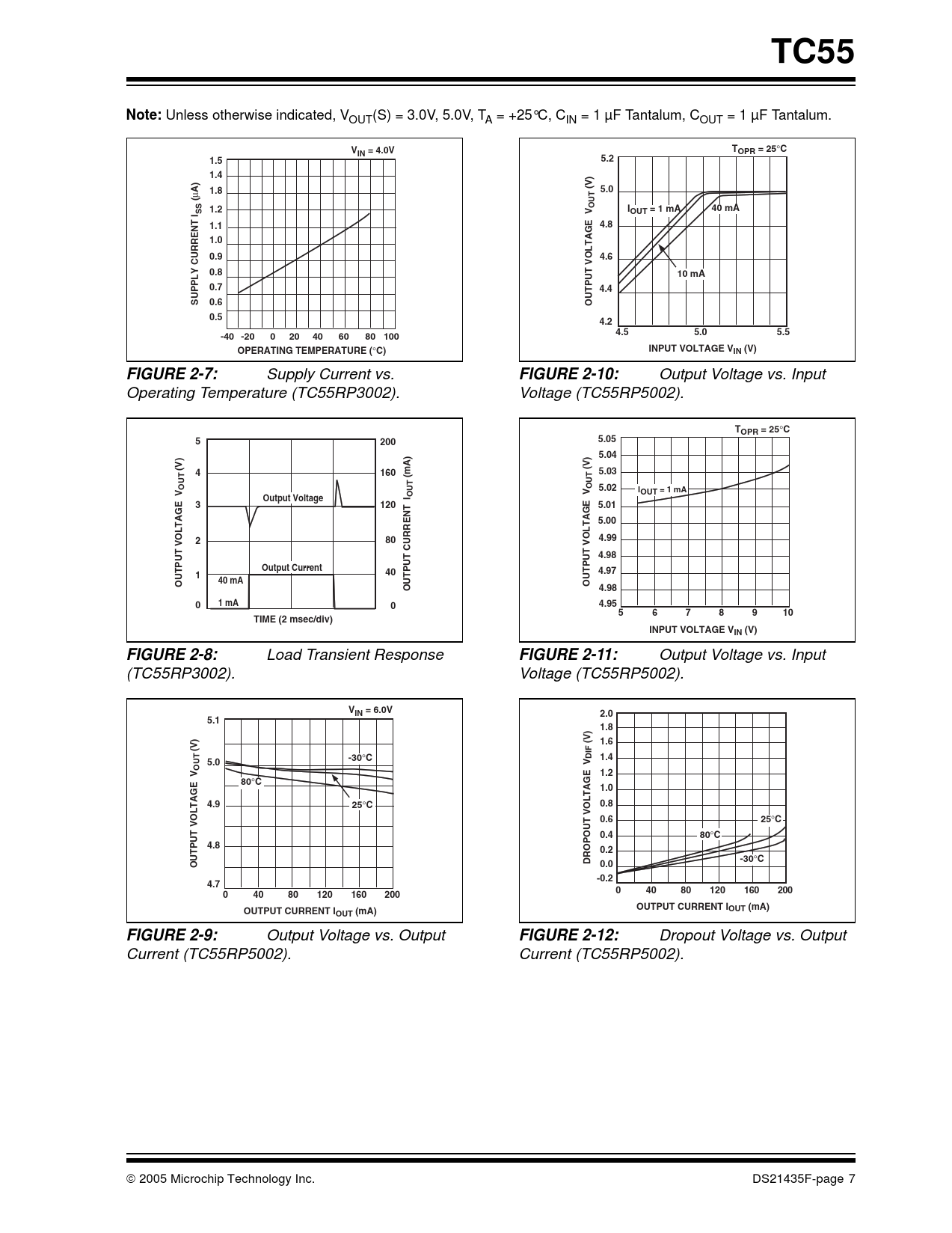 Dropout Voltage vs. Output Current (TC55RP5002). Current (TC55RP5002). © 2005 Microchip Technology Inc. DS21435F-page 7 Document Outline 1.0 Electrical Characteristics 2.0 Typical Performance Curves FIGURE 2-1: Output Voltage vs. Output Current (TC55RP3002). FIGURE 2-2: Output Voltage vs. Input Voltage (TC55RP3002). FIGURE 2-3: Output Voltage vs. Input Voltage (TC55RP3002). FIGURE 2-4: Dropout Voltage vs. Output Current (TC55RP3002). FIGURE 2-5: Output Voltage vs. Operating Temperature (TC55RP3002). FIGURE 2-6: Supply Current vs. Input Voltage (TC55RP3002). FIGURE 2-7: Supply Current vs. Operating Temperature (TC55RP3002). FIGURE 2-8: Load Transient Response (TC55RP3002). FIGURE 2-9: Output Voltage vs. Output Current (TC55RP5002). FIGURE 2-10: Output Voltage vs. Input Voltage (TC55RP5002). FIGURE 2-11: Output Voltage vs. Input Voltage (TC55RP5002). FIGURE 2-12: Dropout Voltage vs. Output Current (TC55RP5002). FIGURE 2-13: Output Voltage vs. Operating Temperature (TC55RP5002). FIGURE 2-14: Supply Current vs. Input Voltage (TC55RP5002). FIGURE 2-15: Supply Current vs. Operating Temperature (TC55RP5002). FIGURE 2-16: Input Transient Response, 1mA (TC55RP5002). FIGURE 2-17: Input Transient Response, 10mA (TC55RP5002). FIGURE 2-18: Load Transient Response (TC55RP5002). 3.0 Pin Descriptions TABLE 3-1: Pin Function Table 3.1 Ground Terminal (GND) 3.2 Regulated Voltage Output (VOUT) 3.3 Unregulated Supply Input (VIN) 4.0 Detailed Description 4.1 Output Capacitor 4.2 Input Capacitor 5.0 Thermal Considerations 5.1 Power Dissipation 6.0 Packaging Information 6.1 Package Marking Information Worldwide Sales and Service Trademarks Worldwide Sales