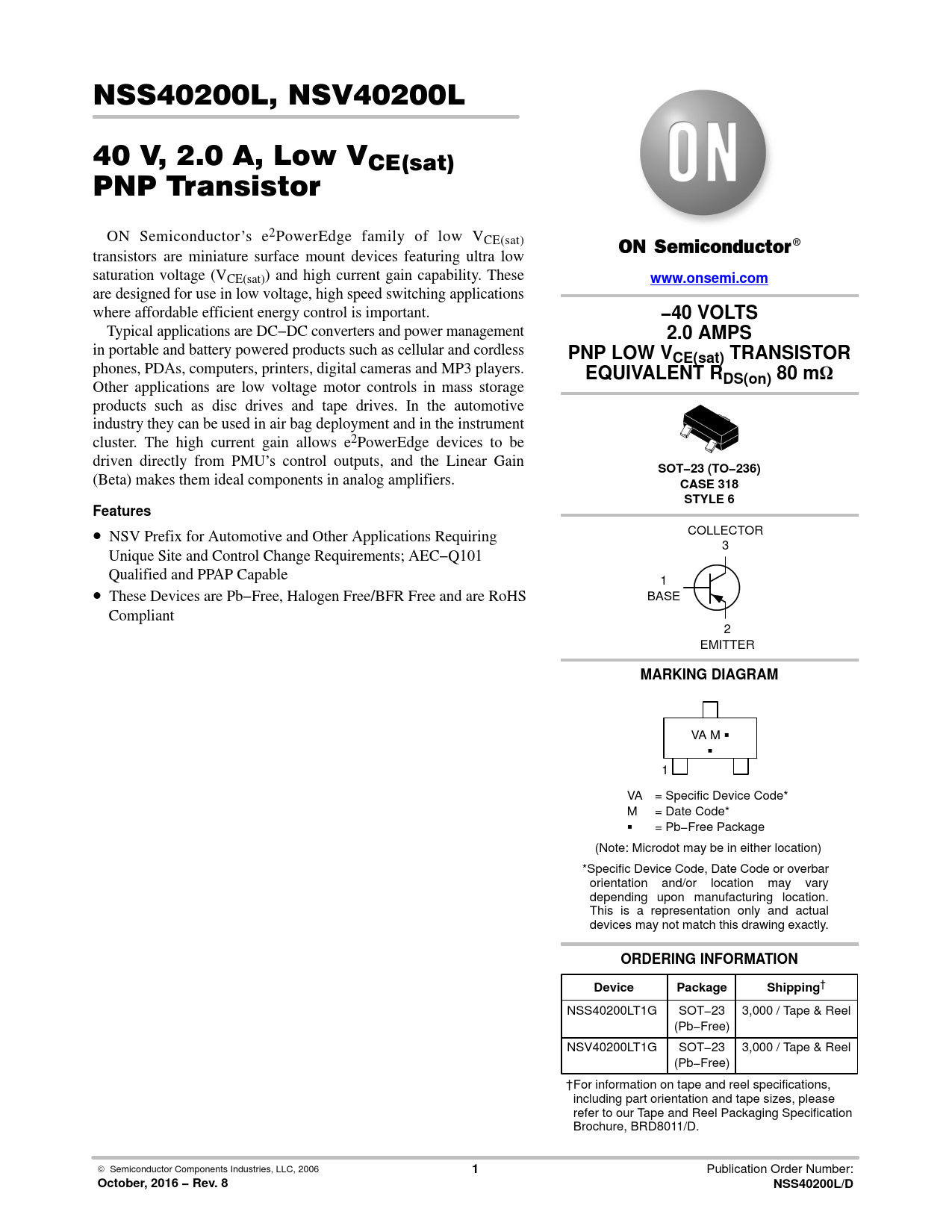 NSS40200L, NSV40200L 40 V, 2.0 A, Low VCE(sat) PNP Transistor ON Semiconductor’s e2PowerEdge family of low VCE(sat) transistors are miniature surface mount devices featuring ultra low saturation voltage (VCE(sat)) and high current gain capability. These