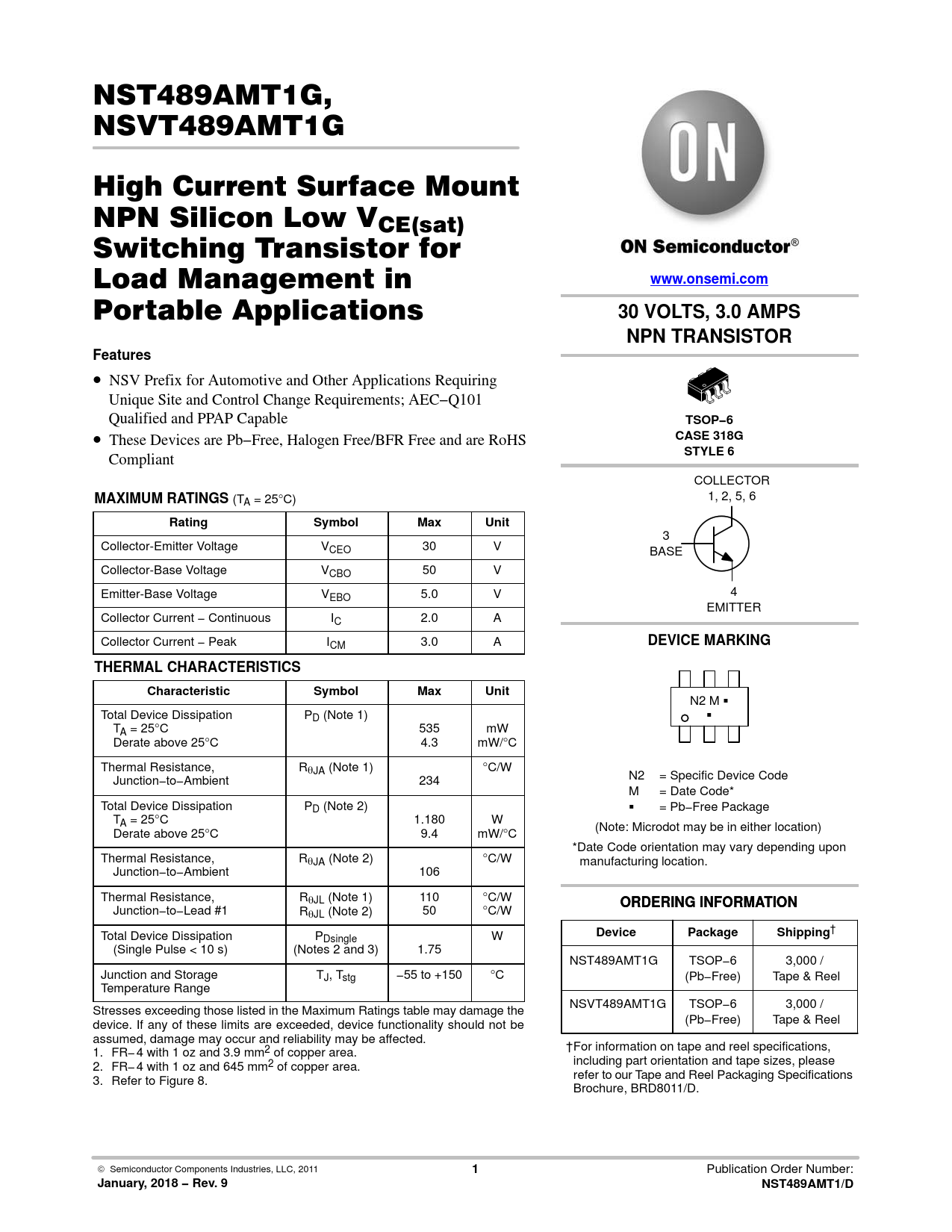 www.onsemi.com. 30 VOLTS, 3.0 AMPS. NPN TRANSISTOR. Features. TSOP−6. CASE 318G. STYLE 6. MAXIMUM RATINGS. Rating. Symbol. Max. Unit