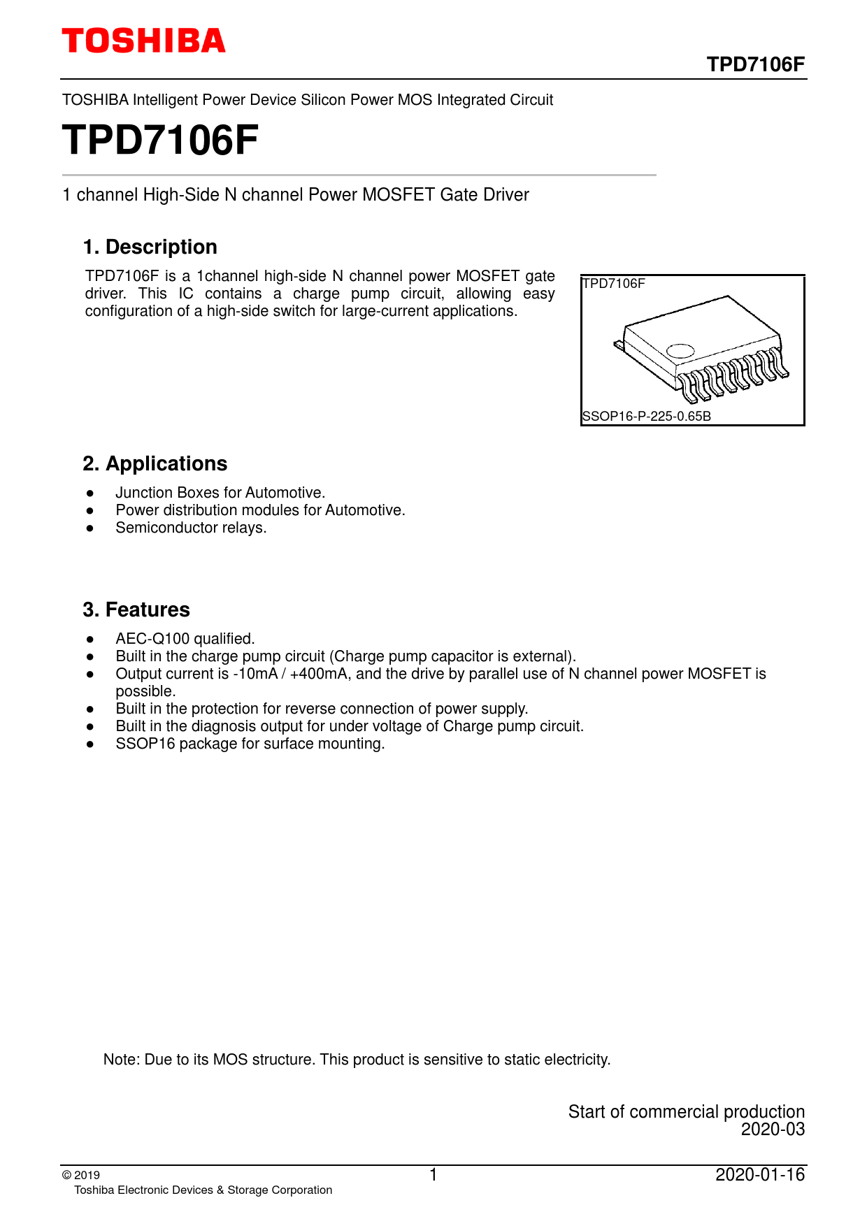 ● AEC-Q100 qualified. ● Built in the charge pump circuit (Charge pump capacitor is external). ● Output current is -10mA / +400mA, and the drive by parallel use of N channel power MOSFET is possible. ● Built in the protection for reverse connection of power supply. ● Built in the diagnosis output for under voltage of Charge pump circuit. ● SSOP16 package for surface mounting. Note: Due to its MOS structure. This product is sensitive to static electricity. Start of commercial production 2020-03 © 2 019 1 2020-01-16 Toshiba Electronic Devices & Storage Corporation