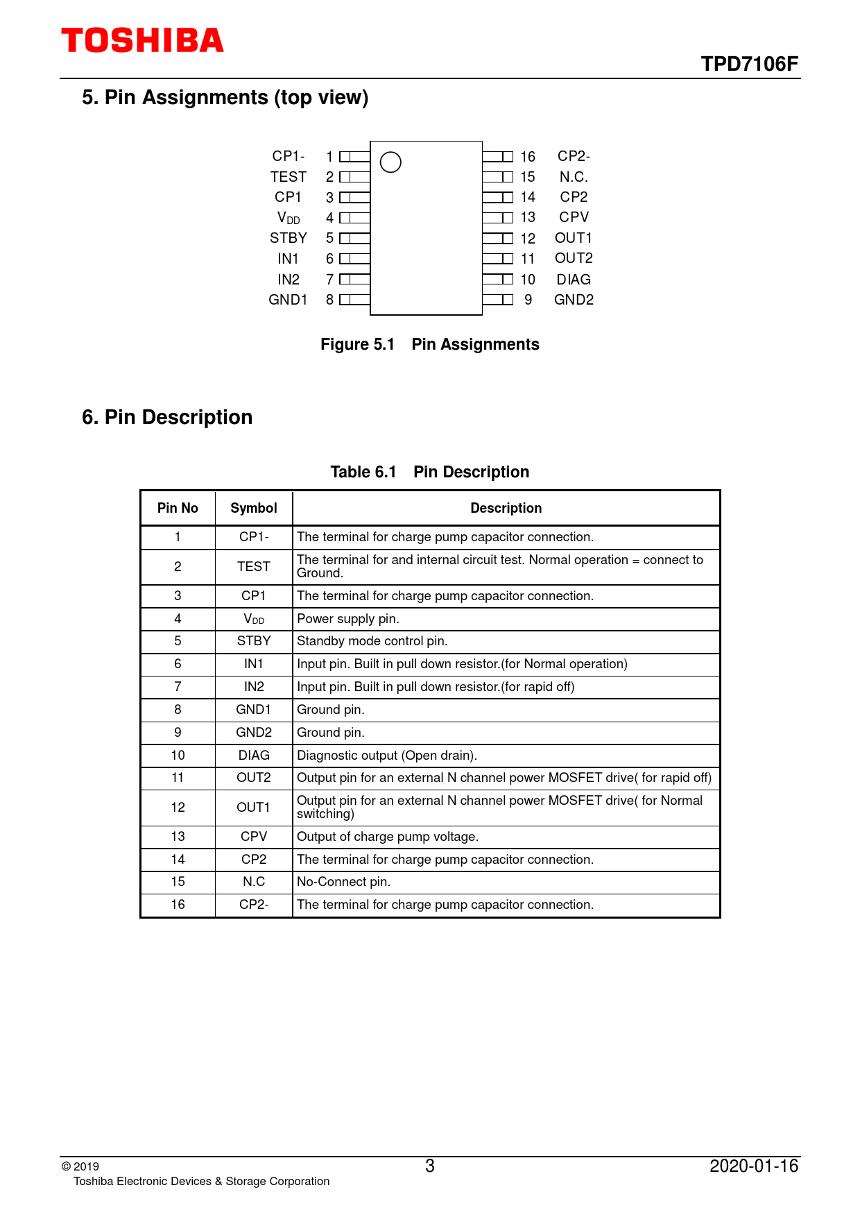TPD7106F. 5. Pin Assignments (top view). Figure 5.1 Pin Assignments. 6. Pin Description. Table 6.1 Pin Description. Pin No. Symbol