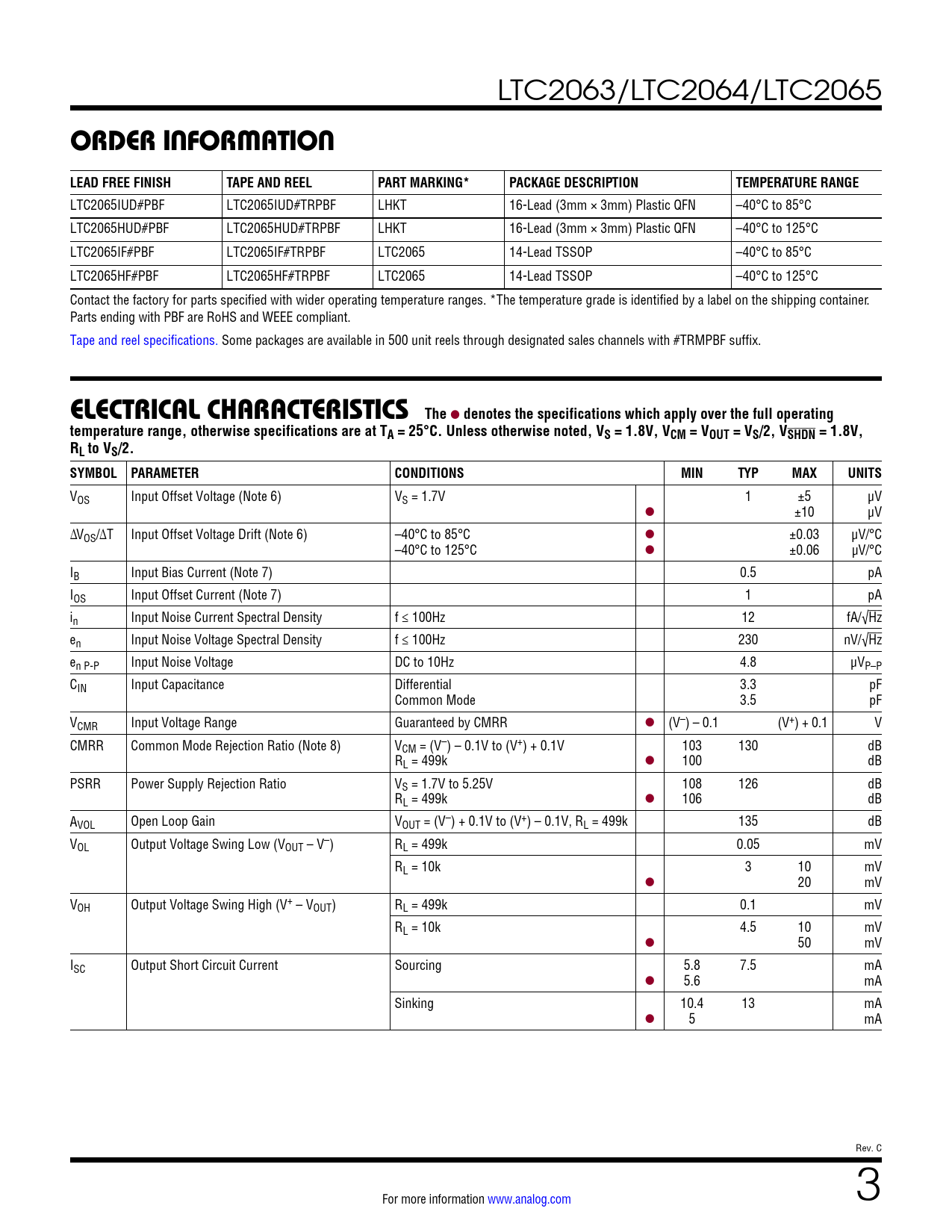 LTC2063/LTC2064/LTC2065 ORDER INFORMATIONLEAD FREE FINISHTAPE AND REELPART MARKING*PACKAGE DESCRIPTIONTEMPERATURE RANGE LTC2065IUD#PBF LTC2065IUD#TRPBF LHKT 16-Lead (3mm × 3mm) Plastic QFN –40°C to 85°C LTC2065HUD#PBF LTC2065HUD#TRPBF LHKT 16-Lead (3mm × 3mm) Plastic QFN –40°C to 125°C LTC2065IF#PBF LTC2065IF#TRPBF LTC2065 14-Lead TSSOP –40°C to 85°C LTC2065HF#PBF LTC2065HF#TRPBF LTC2065 14-Lead TSSOP –40°C to 125°C Contact the factory for parts specified with wider operating temperature ranges. *The temperature grade is identified by a label on the shipping container. Parts ending with PBF are RoHS and WEEE compliant. Tape and reel specifications. Some packages are available in 500 unit reels through designated sales channels with #TRMPBF suffix. ELECTRICAL CHARACTERISTICSThe l denotes the specifications which apply over the full operatingtemperature range, otherwise specifications are at TA = 25°C. Unless otherwise noted, VS = 1.8V, VCM = VOUT = VS/2, VSHDN = 1.8V,RL to VS/2. SYMBOL PARAMETERCONDITIONSMINTYPMAXUNITS VOS Input Offset Voltage (Note 6) VS = 1.7V 1 ±5 μV l ±10 μV ΔVOS/ΔT Input Offset Voltage Drift (Note 6) –40°C to 85°C l ±0.03 μV/°C –40°C to 125°C l ±0.06 µV/°C IB Input Bias Current (Note 7) 0.5 pA IOS Input Offset Current (Note 7) 1 pA in Input Noise Current Spectral Density f ≤ 100Hz 12 fA/√Hz en Input Noise Voltage Spectral Density f ≤ 100Hz 230 nV/√Hz en P-P Input Noise Voltage DC to 10Hz 4.8 μVP–P CIN Input Capacitance Differential 3.3 pF Common Mode 3.5 pF VCMR Input Voltage Range Guaranteed by CMRR l (V–) – 0.1 (V+) + 0.1 V CMRR Common Mode Rejection Ratio (Note 8) VCM = (V–) – 0.1V to (V+) + 0.1V 103 130 dB RL = 499k l 100 dB PSRR Power Supply Rejection Ratio VS = 1.7V to 5.25V 108 126 dB RL = 499k l 106 dB AVOL Open Loop Gain VOUT = (V–) + 0.1V to (V+) – 0.1V, RL = 499k 135 dB VOL Output Voltage Swing Low (VOUT – V–) RL = 499k 0.05 mV RL = 10k 3 10 mV l 20 mV VOH Output Voltage Swing High (V+ – VOUT) RL = 499k 0.1 mV RL = 10k 4.5 10 mV l 50 mV ISC Output Short Circuit Current Sourcing 5.8 7.5 mA l 5.6 mA Sinking 10.4 13 mA l 5 mA Rev. C For more information www.analog.com 3 Document Outline Features Applications Typical Application Description Absolute Maximum Ratings Pin Configuration Order Information Electrical Characteristics Typical Performance Characteristics Pin Functions Block Diagram Applications Information Typical Applications Package Description Revision History Typical Application Related Parts