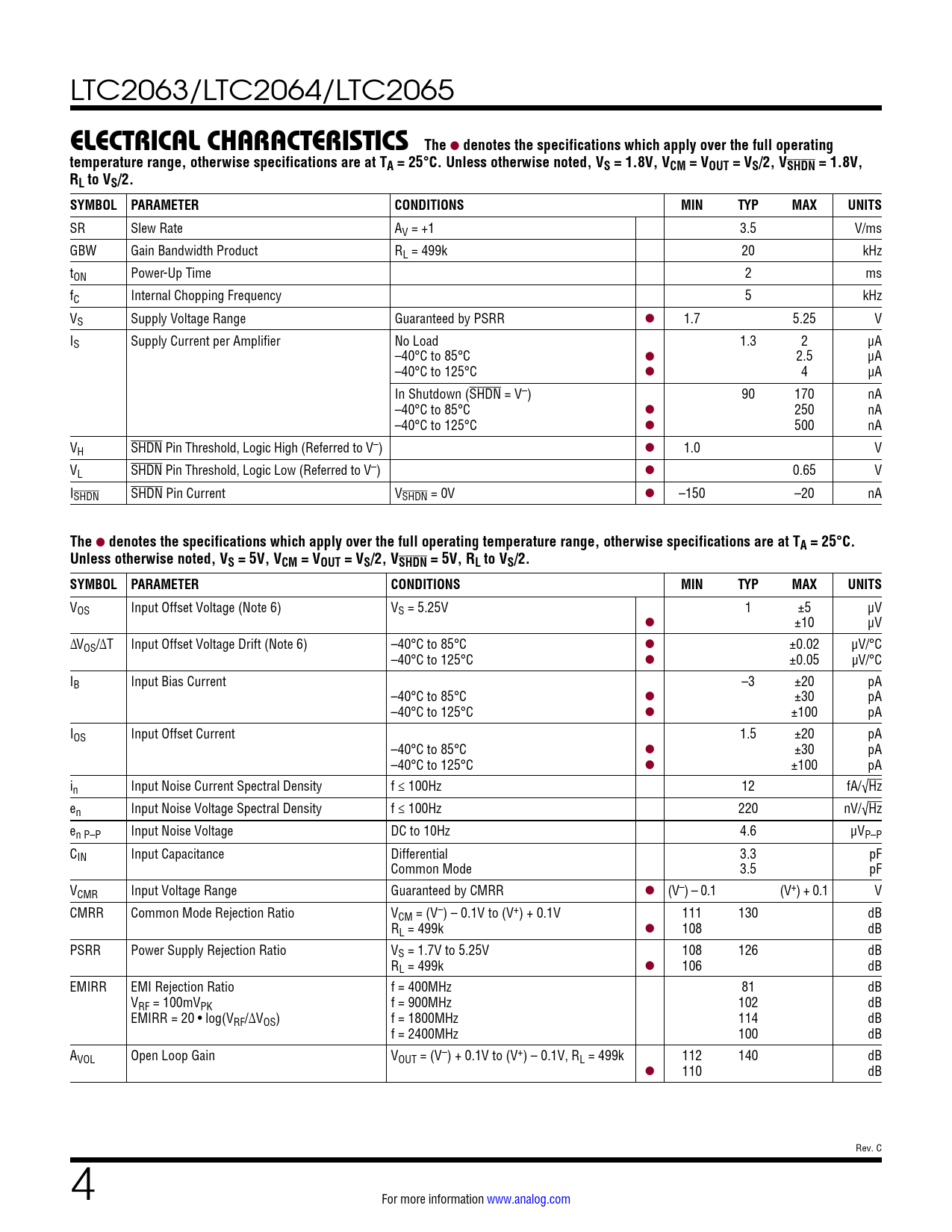 LTC2063/LTC2064/LTC2065 ELECTRICAL CHARACTERISTICSThe l denotes the specifications which apply over the full operatingtemperature range, otherwise specifications are at TA = 25°C. Unless otherwise noted, VS = 1.8V, VCM = VOUT = VS/2, VSHDN = 1.8V,RL to VS/2. SYMBOL PARAMETERCONDITIONSMINTYPMAXUNITS SR Slew Rate AV = +1 3.5 V/ms GBW Gain Bandwidth Product RL = 499k 20 kHz tON Power-Up Time 2 ms fC Internal Chopping Frequency 5 kHz VS Supply Voltage Range Guaranteed by PSRR l 1.7 5.25 V IS Supply Current per Amplifier No Load 1.3 2 μA –40°C to 85°C l 2.5 μA –40°C to 125°C l 4 µA In Shutdown (SHDN = V–) 90 170 nA –40°C to 85°C l 250 nA –40°C to 125°C l 500 nA VH SHDN Pin Threshold, Logic High (Referred to V–) l 1.0 V VL SHDN Pin Threshold, Logic Low (Referred to V–) l 0.65 V ISHDN SHDN Pin Current VSHDN = 0V l –150 –20 nA The l denotes the specifications which apply over the full operating temperature range, otherwise specifications are at TA = 25°C.Unless otherwise noted, VS = 5V, VCM = VOUT = VS/2, VSHDN = 5V, RL to VS/2. SYMBOL PARAMETERCONDITIONSMINTYPMAXUNITS VOS Input Offset Voltage (Note 6) VS = 5.25V 1 ±5 μV l ±10 μV ΔVOS/ΔT Input Offset Voltage Drift (Note 6) –40°C to 85°C l ±0.02 μV/°C –40°C to 125°C l ±0.05 µV/°C IB Input Bias Current –3 ±20 pA –40°C to 85°C l ±30 pA –40°C to 125°C l ±100 pA IOS Input Offset Current 1.5 ±20 pA –40°C to 85°C l ±30 pA –40°C to 125°C l ±100 pA in Input Noise Current Spectral Density f ≤ 100Hz 12 fA/√Hz en Input Noise Voltage Spectral Density f ≤ 100Hz 220 nV/√Hz en P–P Input Noise Voltage DC to 10Hz 4.6 μVP–P CIN Input Capacitance Differential 3.3 pF Common Mode 3.5 pF VCMR Input Voltage Range Guaranteed by CMRR l (V–) – 0.1 (V+) + 0.1 V CMRR Common Mode Rejection Ratio VCM = (V–) – 0.1V to (V+) + 0.1V 111 130 dB RL = 499k l 108 dB PSRR Power Supply Rejection Ratio VS = 1.7V to 5.25V 108 126 dB RL = 499k l 106 dB EMIRR EMI Rejection Ratio f = 400MHz 81 dB VRF = 100mVPK f = 900MHz 102 dB EMIRR = 20 • log(VRF/ΔVOS) f = 1800MHz 114 dB f = 2400MHz 100 dB AVOL Open Loop Gain VOUT = (V–) + 0.1V to (V+) – 0.1V, RL = 499k 112 140 dB l 110 dB Rev. C 4 For more information www.analog.com Document Outline Features Applications Typical Application Description Absolute Maximum Ratings Pin Configuration Order Information Electrical Characteristics Typical Performance Characteristics Pin Functions Block Diagram Applications Information Typical Applications Package Description Revision History Typical Application Related Parts