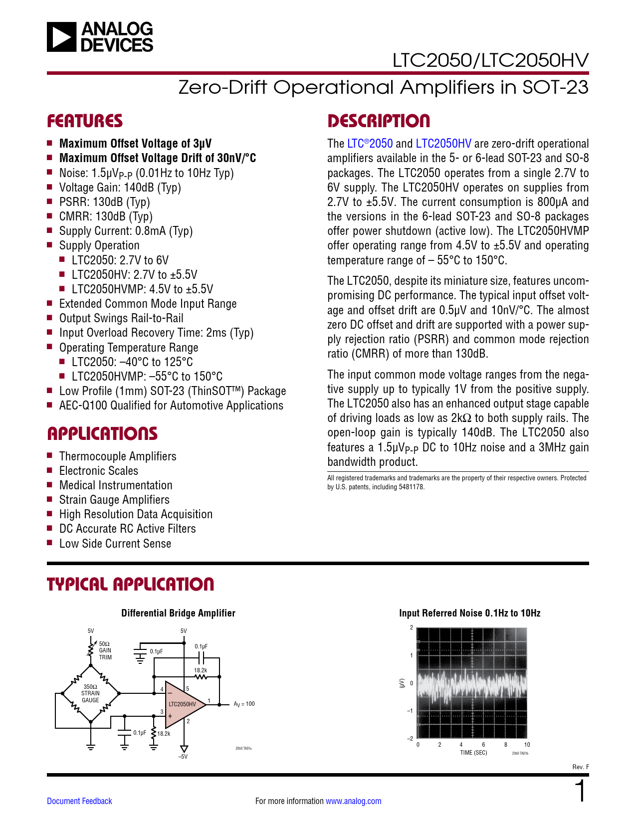 LTC2050/LTC2050HV Zero-Drift Operational Amplifiers in SOT-23 FEATURESDESCRIPTION n Maximum Offset Voltage of 3µV The LTC®2050 and LTC2050HV are zero-drift operational n Maximum Offset Voltage Drift of 30nV/°C amplifiers available in the 5- or 6-lead SOT-23 and SO-8 n Noise: 1.5µVP-P (0.01Hz to 10Hz Typ) packages. The LTC2050 operates from a single 2.7V to n Voltage Gain: 140dB (Typ) 6V supply. The LTC2050HV operates on supplies from n PSRR: 130dB (Typ) 2.7V to ±5.5V. The current consumption is 800µA and n CMRR: 130dB (Typ) the versions in the 6-lead SOT-23 and SO-8 packages n Supply Current: 0.8mA (Typ) offer power shutdown (active low). The LTC2050HVMP n Supply Operation offer operating range from 4.5V to ±5.5V and operating n LTC2050: 2.7V to 6V temperature range of – 55°C to 150°C. n LTC2050HV: 2.7V to ±5.5V The LTC2050, despite its miniature size, features uncom- n LTC2050HVMP: 4.5V to ±5.5V promising DC performance. The typical input offset volt- n Extended Common Mode Input Range age and offset drift are 0.5µV and 10nV/°C. The almost n Output Swings Rail-to-Rail zero DC offset and drift are supported with a power sup- n Input Overload Recovery Time: 2ms (Typ) ply rejection ratio (PSRR) and common mode rejection n Operating Temperature Range ratio (CMRR) of more than 130dB. n LTC2050: –40°C to 125°C n LTC2050HVMP: –55°C to 150°C The input common mode voltage ranges from the nega- n Low Profile (1mm) SOT-23 (ThinSOT™) Package tive supply up to typically 1V from the positive supply. n AEC-Q100 Qualified for Automotive Applications The LTC2050 also has an enhanced output stage capable of driving loads as low as 2kΩ to both supply rails. The APPLICATIONS open-loop gain is typically 140dB. The LTC2050 also features a 1.5µVP-P DC to 10Hz noise and a 3MHz gain n Thermocouple Amplifiers bandwidth product. n Electronic Scales All registered trademarks and trademarks are the property of their respective owners. Protected n Medical Instrumentation by U.S. patents, including 5481178. n Strain Gauge Amplifiers n High Resolution Data Acquisition n DC Accurate RC Active Filters n Low Side Current Sense TYPICAL APPLICATIONDifferential Bridge AmplifierInput Referred Noise 0.1Hz to 10Hz 5V 5V 2 50Ω 0.1µF GAIN 0.1µF TRIM 1 18.2k 350Ω 0 4 (µV) STRAIN – 5 GAUGE 1 LTC2050HV AV = 100 3 + –1 2 0.1µF 18.2k –2 0 2 4 6 8 10 2050 TA01a TIME (SEC) –5V 2050 TA01b Rev. F Document Feedback For more information www.analog.com 1 Document Outline Features Applications Typical Application Description Absolute Maximum Ratings Pin Configuration Order Information Electrical Characteristics Typical Performance Characteristics Test Circuits Applications Information Typical Applications Package Description Revision History Typical Application Related Parts
