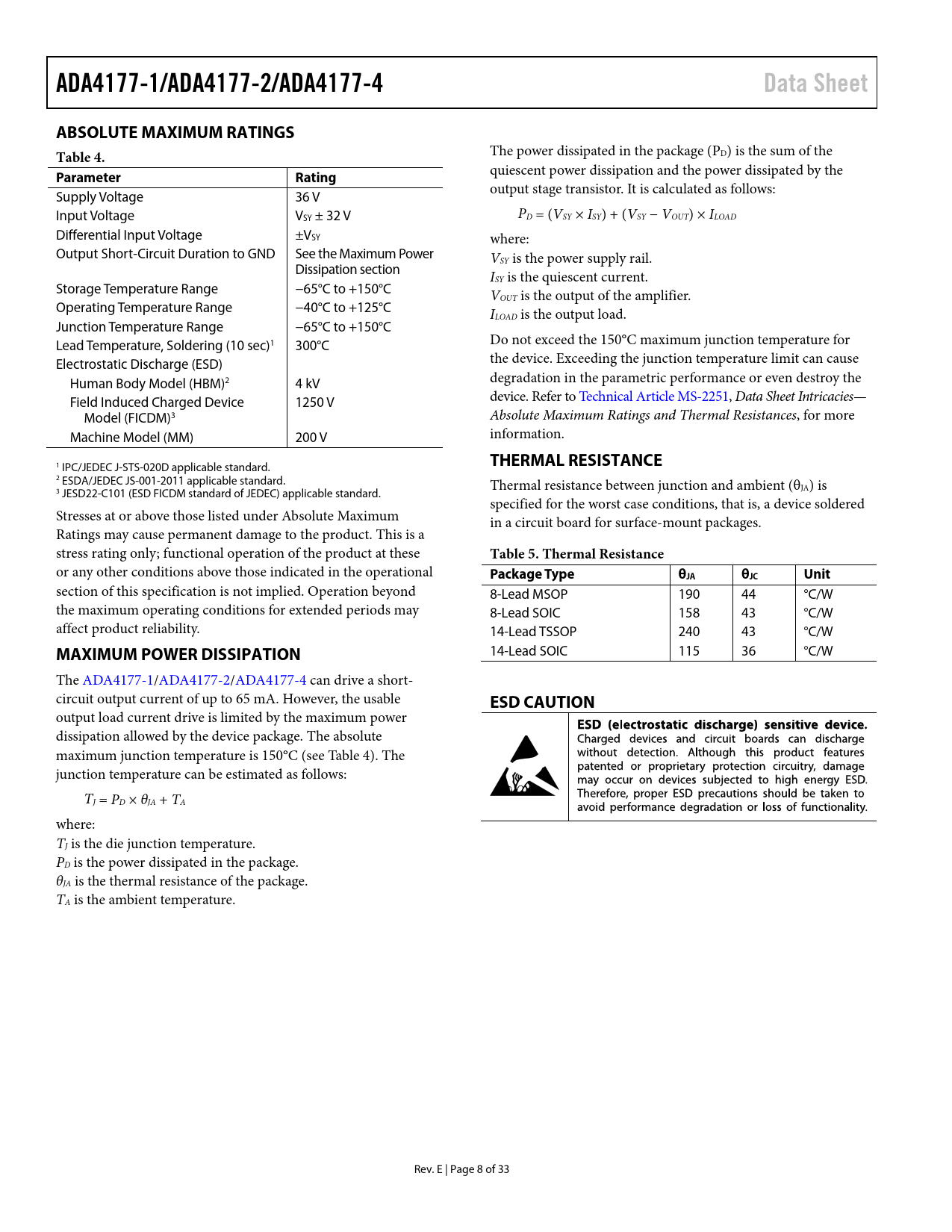 ADA4177-1/ADA4177-2/ADA4177-4 Data Sheet ABSOLUTE MAXIMUM RATINGS Table 4 Parameter Rating THERMAL RESISTANCE