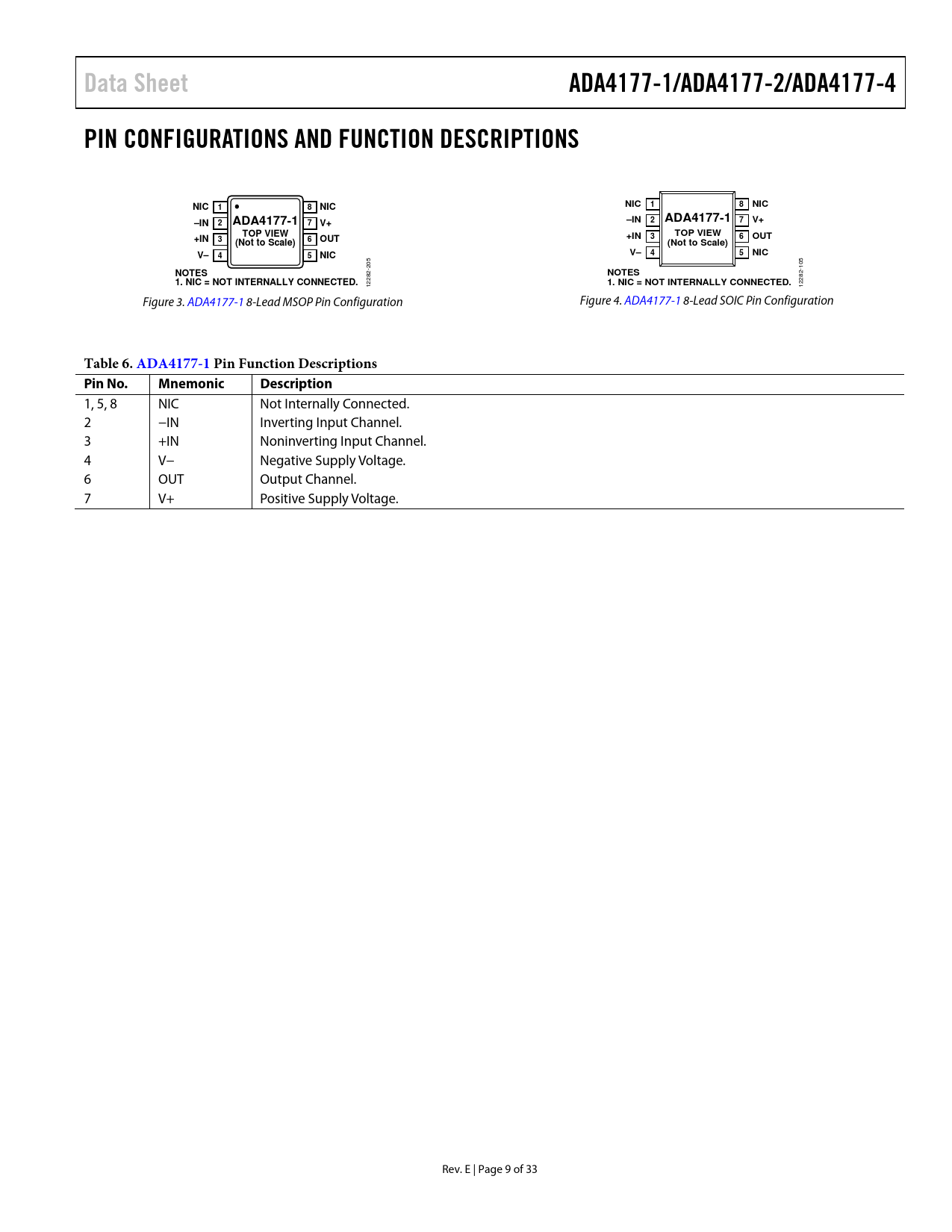 Data Sheet ADA4177-1/ADA4177-2/ADA4177-4 PIN CONFIGURATIONS AND FUNCTION DESCRIPTIONS NIC ADA4177-1 –IN ADA4177-1 7 V+