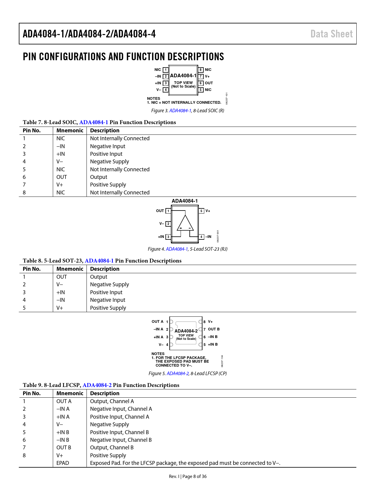 ADA4084-1/ADA4084-2/ADA4084-4Data SheetPIN CONFIGURATIONS AND FUNCTION DESCRIPTIONSNIC18NIC–IN2ADA4084-1 7 V++IN3TOP VIEW6OUT(Not to Scale)V–45NIC 101 NOTES 1. NIC = NOT INTERNALLY CONNECTED. 08237- Figure 3. ADA4084-1, 8-Lead SOIC (R) Table 7. 8-Lead SOIC, ADA4084-1 Pin Function Descriptions Pin No.Mnemonic Description 1 NIC Not Internally Connected 2 −IN Negative Input 3 +IN Positive Input 4 V− Negative Supply 5 NIC Not Internally Connected 6 OUT Output 7 V+ Positive Supply 8 NIC Not Internally Connected ADA4084-1OUT 15V+V– 2 301 +IN 34–IN 08237- Figure 4. ADA4084-1, 5-Lead SOT-23 (RJ) Table 8. 5-Lead SOT-23, ADA4084-1Pin Function Descriptions Pin No.Mnemonic Description 1 OUT Output 2 V− Negative Supply 3 +IN Positive Input 4 −IN Negative Input 5 V+ Positive Supply OUT A 18 V+–IN A 27 OUT BADA4084-2+IN A 3TOP VIEW6 –IN B(Not to Scale)V– 45 +IN BNOTES 1. FOR THE LFCSP PACKAGE, 104 THE EXPOSED PAD MUST BE CONNECTED TO V–. 08237- Figure 5. ADA4084-2, 8-Lead LFCSP (CP) Table 9. 8-Lead LFCSP, ADA4084-2 Pin Function Descriptions Pin No.Mnemonic Description 1 OUT A Output, Channel A 2 −IN A Negative Input, Channel A 3 +IN A Positive Input, Channel A 4 V− Negative Supply 5 +IN B Positive Input, Channel B 6 −IN B Negative Input, Channel B 7 OUT B Output, Channel B 8 V+ Positive Supply EPAD Exposed Pad. For the LFCSP package, the exposed pad must be connected to V−. Rev. I | Page 8 of 36 Document Outline FEATURES APPLICATIONS PIN CONNECTION DIAGRAM GENERAL DESCRIPTION TABLE OF CONTENTS REVISION HISTORY SPECIFICATIONS ELECTRICAL CHARACTERISTICS ABSOLUTE MAXIMUM RATINGS THERMAL RESISTANCE ESD CAUTION PIN CONFIGURATIONS AND FUNCTION DESCRIPTIONS TYPICAL PERFORMANCE CHARACTERISTICS ±1.5 V CHARACTERISTICS ±5 V CHARACTERISTICS ±15 V CHARACTERISTICS APPLICATIONS INFORMATION FUNCTIONAL DESCRIPTION START-UP CHARACTERISTICS INPUT PROTECTION OUTPUT PHASE REVERSAL DESIGNING LOW NOISE CIRCUITS IN SINGLE-SUPPLY APPLICATIONS COMPARATOR OPERATION LONG-TERM DRIFT TEMPERATURE HYSTERESIS OUTLINE DIMENSIONS ORDERING GUIDE
