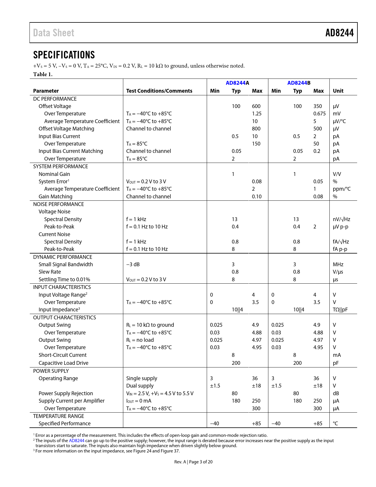 link to page 11 link to page 13 Data SheetAD8244SPECIFICATIONS +VS = 5 V, –VS = 0 V, TA = 25°C, VIN = 0.2 V, RL = 10 kΩ to ground, unless otherwise noted. Table 1.AD8244AAD8244BParameterTest Conditions/CommentsMinTypMaxMinTypMaxUnit DC PERFORMANCE Offset Voltage 100 600 100 350 µV Over Temperature TA = −40°C to +85°C 1.25 0.675 mV Average Temperature Coefficient TA = −40°C to +85°C 10 5 µV/°C Offset Voltage Matching Channel to channel 800 500 µV Input Bias Current 0.5 10 0.5 2 pA Over Temperature TA = 85°C 150 50 pA Input Bias Current Matching Channel to channel 0.05 0.05 0.2 pA Over Temperature TA = 85°C 2 2 pA SYSTEM PERFORMANCE Nominal Gain 1 1 V/V System Error1 VOUT = 0.2 V to 3 V 0.08 0.05 % Average Temperature Coefficient TA = −40°C to +85°C 2 1 ppm/°C Gain Matching Channel to channel 0.10 0.08 % NOISE PERFORMANCE Voltage Noise Spectral Density f = 1 kHz 13 13 nV/√Hz Peak-to-Peak f = 0.1 Hz to 10 Hz 0.4 0.4 2 µV p-p Current Noise Spectral Density f = 1 kHz 0.8 0.8 fA/√Hz Peak-to-Peak f = 0.1 Hz to 10 Hz 8 8 fA p-p DYNAMIC PERFORMANCE Small Signal Bandwidth −3 dB 3 3 MHz Slew Rate 0.8 0.8 V/µs Settling Time to 0.01% VOUT = 0.2 V to 3 V 8 8 µs INPUT CHARACTERISTICS Input Voltage Range2 0 4 0 4 V Over Temperature TA = −40°C to +85°C 0 3.5 0 3.5 V Input Impedance3 10||4 10||4 TΩ||pF OUTPUT CHARACTERISTICS Output Swing RL = 10 kΩ to ground 0.025 4.9 0.025 4.9 V Over Temperature TA = −40°C to +85°C 0.03 4.88 0.03 4.88 V Output Swing RL = no load 0.025 4.97 0.025 4.97 V Over Temperature TA = −40°C to +85°C 0.03 4.95 0.03 4.95 V Short-Circuit Current 8 8 mA Capacitive Load Drive 200 200 pF POWER SUPPLY Operating Range Single supply 3 36 3 36 V Dual supply ±1.5 ±18 ±1.5 ±18 V Power Supply Rejection VIN = 2.5 V, +VS = 4.5 V to 5.5 V 80 80 dB Supply Current per Amplifier IOUT = 0 mA 180 250 180 250 µA Over Temperature TA = −40°C to +85°C 300 300 µA TEMPERATURE RANGE Specified Performance −40 +85 −40 +85 °C 1 Error as a percentage of the measurement. This includes the effects of open-loop gain and common-mode rejection ratio. 2 The inputs of the AD8244 can go up to the positive supply; however, the input range is derated because error increases near the positive supply as the input transistors start to saturate. The inputs also maintain high impedance when driven slightly below ground. 3 For more information on the input impedance, see Figure 24 and Figure 37. Rev. A | Page 3 of 20 Document Outline FEATURES APPLICATIONS PIN CONFIGURATION GENERAL DESCRIPTION TABLE OF CONTENTS REVISION HISTORY SPECIFICATIONS ABSOLUTE MAXIMUM RATINGS THERMAL RESISTANCE ESD CAUTION PIN CONFIGURATION AND FUNCTION DESCRIPTIONS TYPICAL PERFORMANCE CHARACTERISTICS THEORY OF OPERATION OVERVIEW GUARDING INPUT PROTECTION LAYOUT CONSIDERATIONS DIFFERENTIAL SIGNAL CHAINS LOW OUTPUT IMPEDANCE vs. FREQUENCY APPLICATIONS INFORMATION ELECTROCARDIOGRAM (ECG) FILTERING Sallen-Key Low-Pass Filter Sallen-Key High-Pass Filter Twin-T Notch Filter PHOTODIODE AMPLIFIER LOW NOISE, JFET INPUT BUFFER OUTLINE DIMENSIONS ORDERING GUIDE