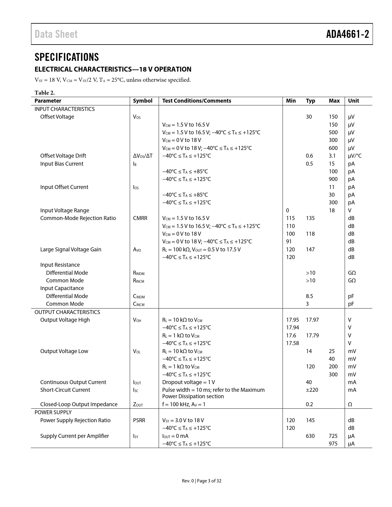 Pages / Page32 / 3 — Data Sheet. ADA4661-2. SPECIFICATIONS ELECTRICAL CHARACTERISTICS—18 V …