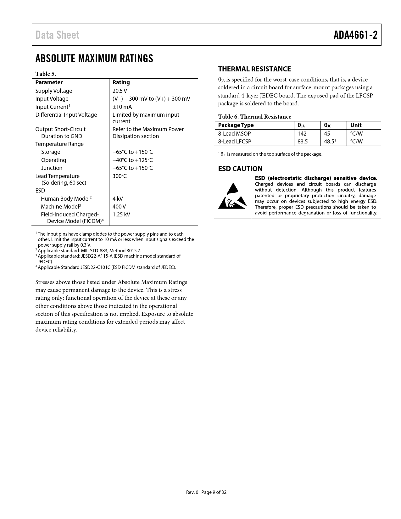 Pages / Page32 / 9 — Data Sheet. ADA4661-2. ABSOLUTE MAXIMUM RATINGS. THERMAL RESISTANCE. …