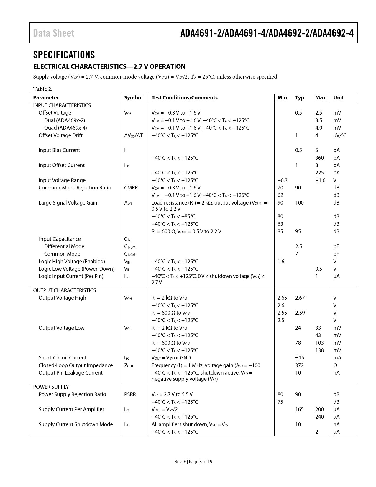 Data SheetADA4691-2/ADA4691-4/ADA4692-2/ADA4692-4SPECIFICATIONS ELECTRICAL CHARACTERISTICS—2.7 V OPERATION Supply voltage (VSY) = 2.7 V, common-mode voltage (VCM) = VSY/2, TA = 25°C, unless otherwise specified. Table 2. ParameterSymbolTest Conditions/CommentsMinTypMaxUnit INPUT CHARACTERISTICS Offset Voltage VOS VCM = −0.3 V to +1.6 V 0.5 2.5 mV Dual (ADA469x-2) VCM = −0.1 V to +1.6 V; −40°C < TA < +125°C 3.5 mV Quad (ADA469x-4) VCM = −0.1 V to +1.6 V; −40°C < TA < +125°C 4.0 mV Offset Voltage Drift ΔVOS/ΔT −40°C < TA < +125°C 1 4 µV/°C Input Bias Current IB 0.5 5 pA −40°C < TA < +125°C 360 pA Input Offset Current IOS 1 8 pA −40°C < TA < +125°C 225 pA Input Voltage Range −40°C < TA < +125°C −0.3 +1.6 V Common-Mode Rejection Ratio CMRR VCM = −0.3 V to +1.6 V 70 90 dB VCM = −0.1 V to +1.6 V; −40°C < TA < +125°C 62 dB Large Signal Voltage Gain AVO Load resistance (RL) = 2 kΩ, output voltage (VOUT) = 90 100 dB 0.5 V to 2.2 V −40°C < TA < +85°C 80 dB −40°C < TA < +125°C 63 dB RL = 600 Ω, VOUT = 0.5 V to 2.2 V 85 95 dB Input Capacitance CIN Differential Mode CINDM 2.5 pF Common Mode CINCM 7 pF Logic High Voltage (Enabled) VIH −40°C < TA < +125°C 1.6 V Logic Low Voltage (Power-Down) VIL −40°C < TA < +125°C 0.5 V Logic Input Current (Per Pin) IIN −40°C < TA < +125°C, 0 V ≤ shutdown voltage (VSD) ≤ 1 µA 2.7 V OUTPUT CHARACTERISTICS Output Voltage High VOH RL = 2 kΩ to VCM 2.65 2.67 V −40°C < TA < +125°C 2.6 V RL = 600 Ω to VCM 2.55 2.59 V −40°C < TA < +125°C 2.5 V Output Voltage Low VOL RL = 2 kΩ to VCM 24 33 mV −40°C < TA < +125°C 43 mV RL = 600 Ω to VCM 78 103 mV −40°C < TA < +125°C 138 mV Short-Circuit Current ISC VOUT = VSY or GND ±15 mA Closed-Loop Output Impedance ZOUT Frequency (f) = 1 MHz, voltage gain (AV) = −100 372 Ω Output Pin Leakage Current −40°C < TA < +125°C, shutdown active, VSD = 10 nA negative supply voltage (VSS) POWER SUPPLY Power Supply Rejection Ratio PSRR VSY = 2.7 V to 5.5 V 80 90 dB −40°C < TA < +125°C 75 dB Supply Current Per Amplifier ISY VOUT = VSY/2 165 200 µA −40°C < TA < +125°C 240 µA Supply Current Shutdown Mode ISD All amplifiers shut down, VSD = VSS 10 nA −40°C < TA < +125°C 2 µA Rev. E | Page 3 of 19 Document Outline Features Applications General Description Revision History Specifications Electrical Characteristics—2.7 V Operation Electrical Characteristics—5 V Operation Absolute Maximum Ratings Thermal Resistance ESD Caution Pin Configurations Typical Performance Characteristics Shutdown Operation Input Pin Characteristics Input Threshold Outline Dimensions Ordering Guide