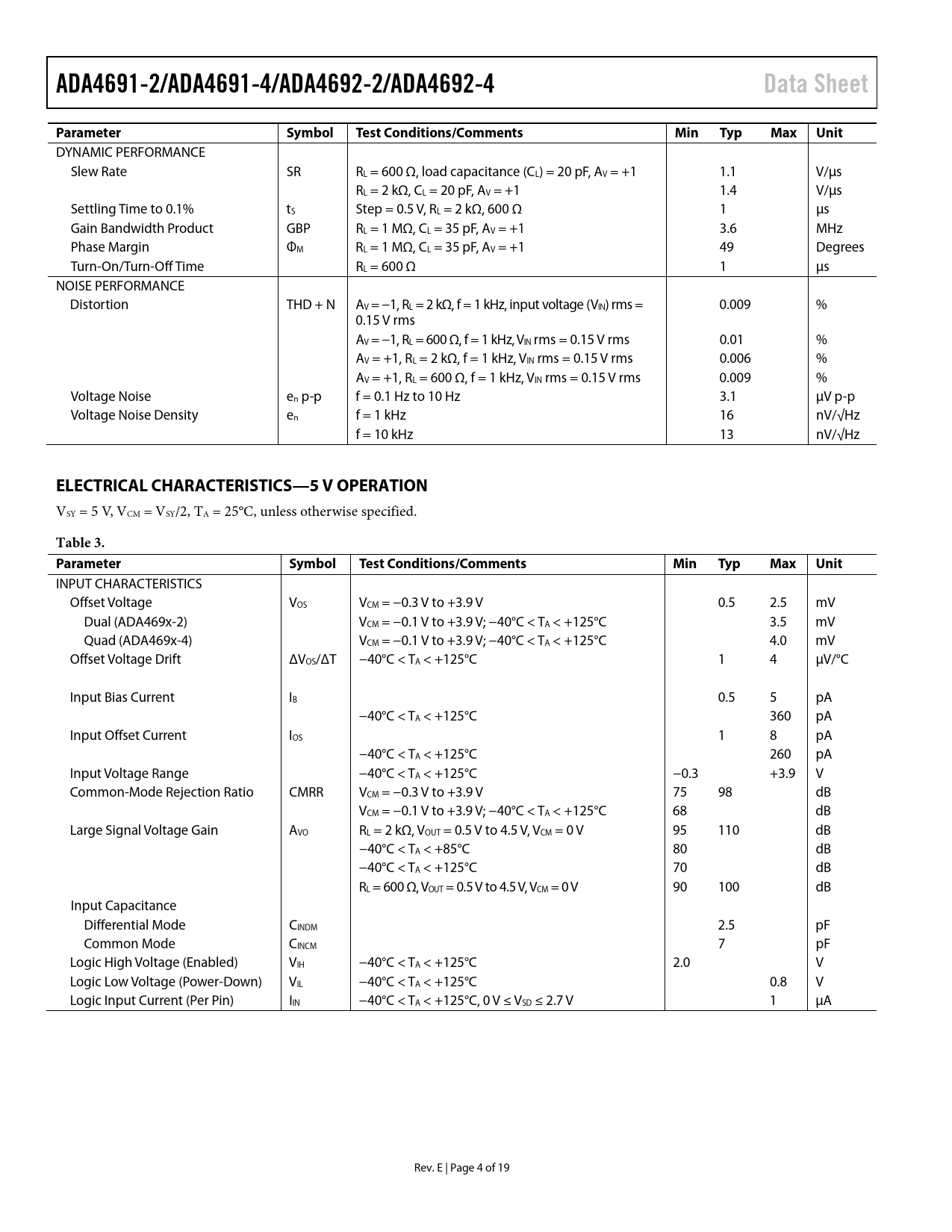ADA4691-2/ADA4691-4/ADA4692-2/ADA4692-4Data SheetParameterSymbolTest Conditions/CommentsMinTypMaxUnit DYNAMIC PERFORMANCE Slew Rate SR RL = 600 Ω, load capacitance (CL) = 20 pF, AV = +1 1.1 V/µs RL = 2 kΩ, CL = 20 pF, AV = +1 1.4 V/µs Settling Time to 0.1% tS Step = 0.5 V, RL = 2 kΩ, 600 Ω 1 µs Gain Bandwidth Product GBP RL = 1 MΩ, CL = 35 pF, AV = +1 3.6 MHz Phase Margin ΦM RL = 1 MΩ, CL = 35 pF, AV = +1 49 Degrees Turn-On/Turn-Off Time RL = 600 Ω 1 µs NOISE PERFORMANCE Distortion THD + N AV = −1, RL = 2 kΩ, f = 1 kHz, input voltage (VIN) rms = 0.009 % 0.15 V rms AV = −1, RL = 600 Ω, f = 1 kHz, VIN rms = 0.15 V rms 0.01 % AV = +1, RL = 2 kΩ, f = 1 kHz, VIN rms = 0.15 V rms 0.006 % AV = +1, RL = 600 Ω, f = 1 kHz, VIN rms = 0.15 V rms 0.009 % Voltage Noise en p-p f = 0.1 Hz to 10 Hz 3.1 µV p-p Voltage Noise Density en f = 1 kHz 16 nV/√Hz f = 10 kHz 13 nV/√Hz ELECTRICAL CHARACTERISTICS—5 V OPERATION VSY = 5 V, VCM = VSY/2, TA = 25°C, unless otherwise specified. Table 3. ParameterSymbolTest Conditions/CommentsMinTypMaxUnit INPUT CHARACTERISTICS Offset Voltage VOS VCM = −0.3 V to +3.9 V 0.5 2.5 mV Dual (ADA469x-2) VCM = −0.1 V to +3.9 V; −40°C < TA < +125°C 3.5 mV Quad (ADA469x-4) VCM = −0.1 V to +3.9 V; −40°C < TA < +125°C 4.0 mV Offset Voltage Drift ΔVOS/ΔT −40°C < TA < +125°C 1 4 µV/°C Input Bias Current IB 0.5 5 pA −40°C < TA < +125°C 360 pA Input Offset Current IOS 1 8 pA −40°C < TA < +125°C 260 pA Input Voltage Range −40°C < TA < +125°C −0.3 +3.9 V Common-Mode Rejection Ratio CMRR VCM = −0.3 V to +3.9 V 75 98 dB VCM = −0.1 V to +3.9 V; −40°C < TA < +125°C 68 dB Large Signal Voltage Gain AVO RL = 2 kΩ, VOUT = 0.5 V to 4.5 V, VCM = 0 V 95 110 dB −40°C < TA < +85°C 80 dB −40°C < TA < +125°C 70 dB RL = 600 Ω, VOUT = 0.5 V to 4.5 V, VCM = 0 V 90 100 dB Input Capacitance Differential Mode CINDM 2.5 pF Common Mode CINCM 7 pF Logic High Voltage (Enabled) VIH −40°C < TA < +125°C 2.0 V Logic Low Voltage (Power-Down) VIL −40°C < TA < +125°C 0.8 V Logic Input Current (Per Pin) IIN −40°C < TA < +125°C, 0 V ≤ VSD ≤ 2.7 V 1 µA Rev. E | Page 4 of 19 Document Outline Features Applications General Description Revision History Specifications Electrical Characteristics—2.7 V Operation Electrical Characteristics—5 V Operation Absolute Maximum Ratings Thermal Resistance ESD Caution Pin Configurations Typical Performance Characteristics Shutdown Operation Input Pin Characteristics Input Threshold Outline Dimensions Ordering Guide