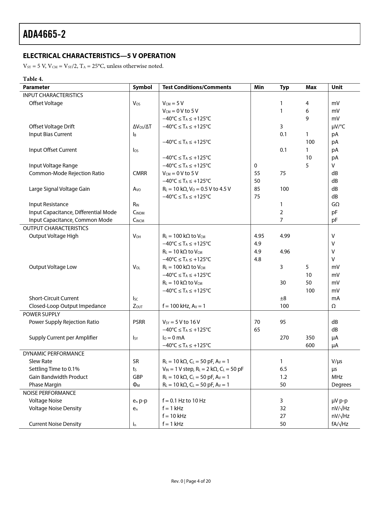 ADA4665-2 ELECTRICAL CHARACTERISTICS—5 V OPERATION Table 4 Parameter Symbol Test Conditions/Comments Min Typ Max Unit