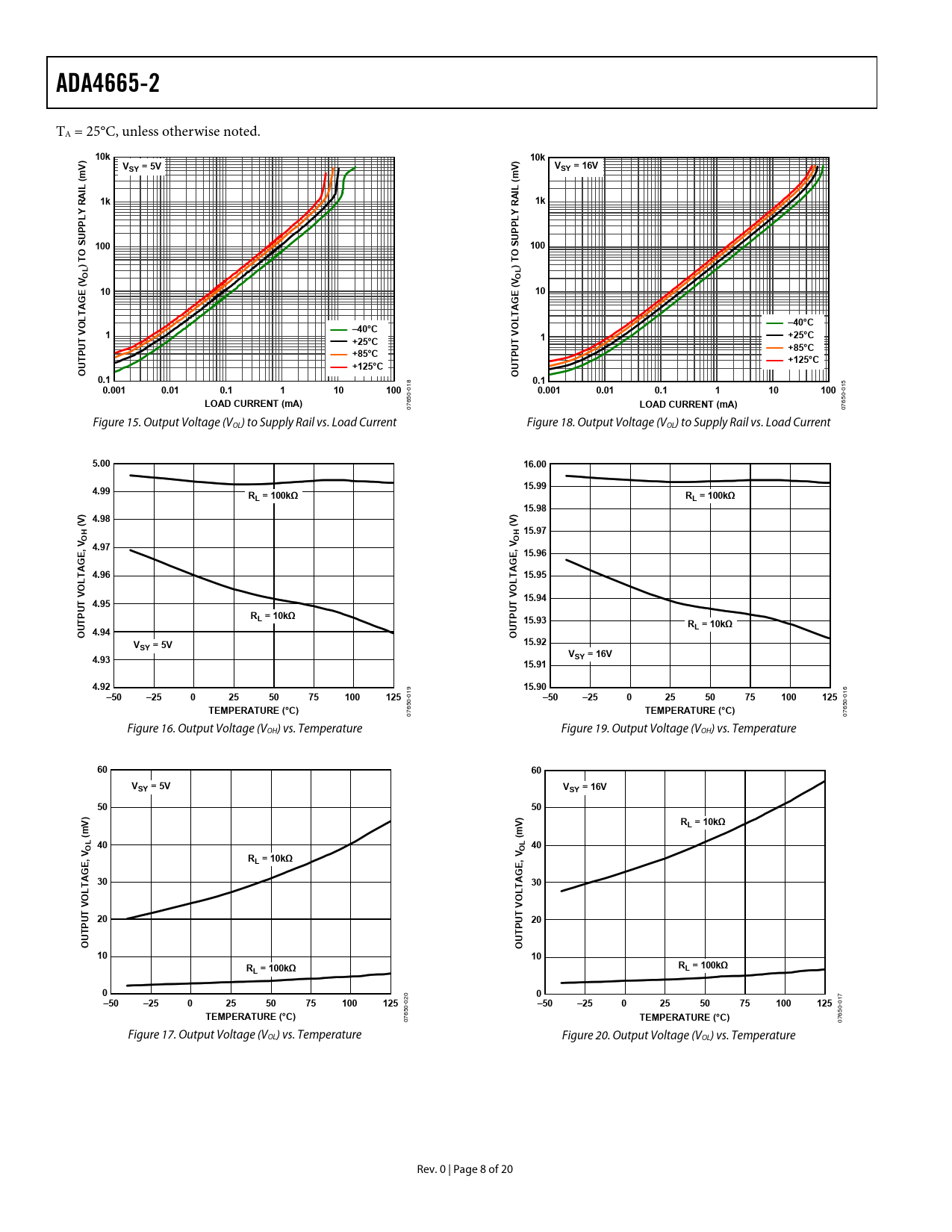 Model Line for this Datasheet Text Version of Document ADA4665-2 TA = 25°C, unless otherwise noted.10k ) 10k ) V VSY = 5V V VSY = 16V m (m ( IL IL A 1k A R 1k R Y Y L L P PP P U U S 100 100 O ) T ) TO S V OL (V OL ( E 10 E 10 G A AG T L T L O –40°C –40°C O V 1 V +25°C T +25°C 1 U UT +85°C P TP +85°C +125°C +125°C UT OU O 0.1 80.1 0.001 0.01 0.1 1 10 100 15 010.001 0.01 0.1 1 10 100 0 0- 0-LOAD CURRENT (mA) 65LOAD CURRENT (mA) 65 07 07 Figure 15. Output Voltage (VOL) to Supply Rail vs. Load Current Figure 18. Output Voltage (VOL) to Supply Rail vs. Load Current5.00 16.00 15.99 4.99 RL = 100kΩ RL = 100kΩ 15.98 ) 4.98 ) (V (V 15.97 OH OH , V 4.97 , V E E 15.96 G G A A T 4.96 T 15.95 L L O O V V T 15.94 4.95 T U U R TP L = 10kΩ TP 15.93 RL = 10kΩ 4.94 OU OU V 15.92 SY = 5V V 4.93 SY = 16V 15.91 4.92 915.90 6–50 –25 0 25 50 75 100 125 01–50 –25 0 25 50 75 100 125 01 0- 0-TEMPERATURE (°C) 65TEMPERATURE (°C) 65 07 07 Figure 16. Output Voltage (VOH) vs. Temperature Figure 19. Output Voltage (VOH) vs. Temperature60 60 VSY = 5V VSY = 16V 50 50 V) V) RL = 10kΩ (m (m 40 OL 40 OL , V R , V E L = 10kΩ E G G A 30 A 30 LT LT O O V V T T U 20 U 20 TP TP OU OU 10 10 R R L = 100kΩ L = 100kΩ 0 00 7–50 –25 0 25 50 75 100 125 02–50 –25 0 25 50 75 100 125 01 0- 0-TEMPERATURE (°C) 65TEMPERATURE (°C) 65 07 07 Figure 17. Output Voltage (VOL) vs. Temperature Figure 20. Output Voltage (VOL) vs. Temperature Rev. 0 | Page 8 of 20 Document Outline FEATURES APPLICATIONS PIN CONFIGURATIONS GENERAL DESCRIPTION TABLE OF CONTENTS REVISION HISTORY SPECIFICATIONS ELECTRICAL CHARACTERISTICS—16 V OPERATION ELECTRICAL CHARACTERISTICS—5 V OPERATION ABSOLUTE MAXIMUM RATINGS THERMAL RESISTANCE ESD CAUTION TYPICAL PERFORMANCE CHARACTERISTICS APPLICATIONS INFORMATION RAIL-TO-RAIL INPUT OPERATION CURRENT SHUNT SENSOR ACTIVE FILTERS OUTLINE DIMENSIONS ORDERING GUIDE