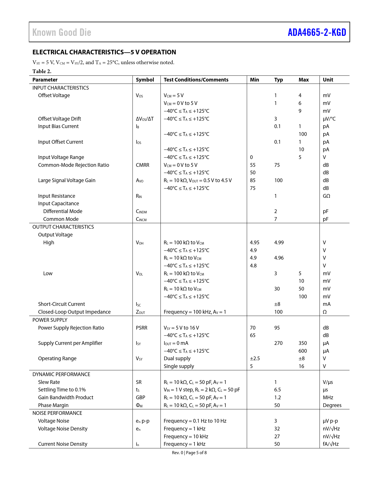 Known Good DieADA4665-2-KGDELECTRICAL CHARACTERISTICS—5 V OPERATION VSY = 5 V, VCM = VSY/2, and TA = 25°C, unless otherwise noted. Table 2. ParameterSymbolTest Conditions/CommentsMinTypMaxUnit INPUT CHARACTERISTICS Offset Voltage VOS VCM = 5 V 1 4 mV VCM = 0 V to 5 V 1 6 mV −40°C ≤ TA ≤ +125°C 9 mV Offset Voltage Drift ∆VOS/∆T −40°C ≤ TA ≤ +125°C 3 µV/°C Input Bias Current IB 0.1 1 pA −40°C ≤ TA ≤ +125°C 100 pA Input Offset Current IOS 0.1 1 pA −40°C ≤ TA ≤ +125°C 10 pA Input Voltage Range −40°C ≤ TA ≤ +125°C 0 5 V Common-Mode Rejection Ratio CMRR VCM = 0 V to 5 V 55 75 dB −40°C ≤ TA ≤ +125°C 50 dB Large Signal Voltage Gain AVO RL = 10 kΩ, VOUT = 0.5 V to 4.5 V 85 100 dB −40°C ≤ TA ≤ +125°C 75 dB Input Resistance RIN 1 GΩ Input Capacitance Differential Mode CINDM 2 pF Common Mode CINCM 7 pF OUTPUT CHARACTERISTICS Output Voltage High VOH RL = 100 kΩ to VCM 4.95 4.99 V −40°C ≤ TA ≤ +125°C 4.9 V RL = 10 kΩ to VCM 4.9 4.96 V −40°C ≤ TA ≤ +125°C 4.8 V Low VOL RL = 100 kΩ to VCM 3 5 mV −40°C ≤ TA ≤ +125°C 10 mV RL = 10 kΩ to VCM 30 50 mV −40°C ≤ TA ≤ +125°C 100 mV Short-Circuit Current ISC ±8 mA Closed-Loop Output Impedance ZOUT Frequency = 100 kHz, AV = 1 100 Ω POWER SUPPLY Power Supply Rejection Ratio PSRR VSY = 5 V to 16 V 70 95 dB −40°C ≤ TA ≤ +125°C 65 dB Supply Current per Amplifier ISY IOUT = 0 mA 270 350 µA −40°C ≤ TA ≤ +125°C 600 µA Operating Range VSY Dual supply ±2.5 ±8 V Single supply 5 16 V DYNAMIC PERFORMANCE Slew Rate SR RL = 10 kΩ, CL = 50 pF, AV = 1 1 V/µs Settling Time to 0.1% tS VIN = 1 V step, RL = 2 kΩ, CL = 50 pF 6.5 µs Gain Bandwidth Product GBP RL = 10 kΩ, CL = 50 pF, AV = 1 1.2 MHz Phase Margin ΦM RL = 10 kΩ, CL = 50 pF, AV = 1 50 Degrees NOISE PERFORMANCE Voltage Noise en p-p Frequency = 0.1 Hz to 10 Hz 3 µV p-p Voltage Noise Density en Frequency = 1 kHz 32 nV/√Hz Frequency = 10 kHz 27 nV/√Hz Current Noise Density in Frequency = 1 kHz 50 fA/√Hz Rev. 0 | Page 5 of 8 Document Outline FEATURES APPLICATIONS GENERAL DESCRIPTION TABLE OF CONTENTS REVISION HISTORY SPECIFICATIONS ELECTRICAL CHARACTERISTICS—16 V OPERATION ELECTRICAL CHARACTERISTICS—5 V OPERATION ABSOLUTE MAXIMUM RATINGS ESD CAUTION PIN CONFIGURATION AND FUNCTION DESCRIPTION OUTLINE DIMENSIONS DIE SPECIFICATIONS AND ASSEMBLY RECOMMENDATIONS ORDERING GUIDE