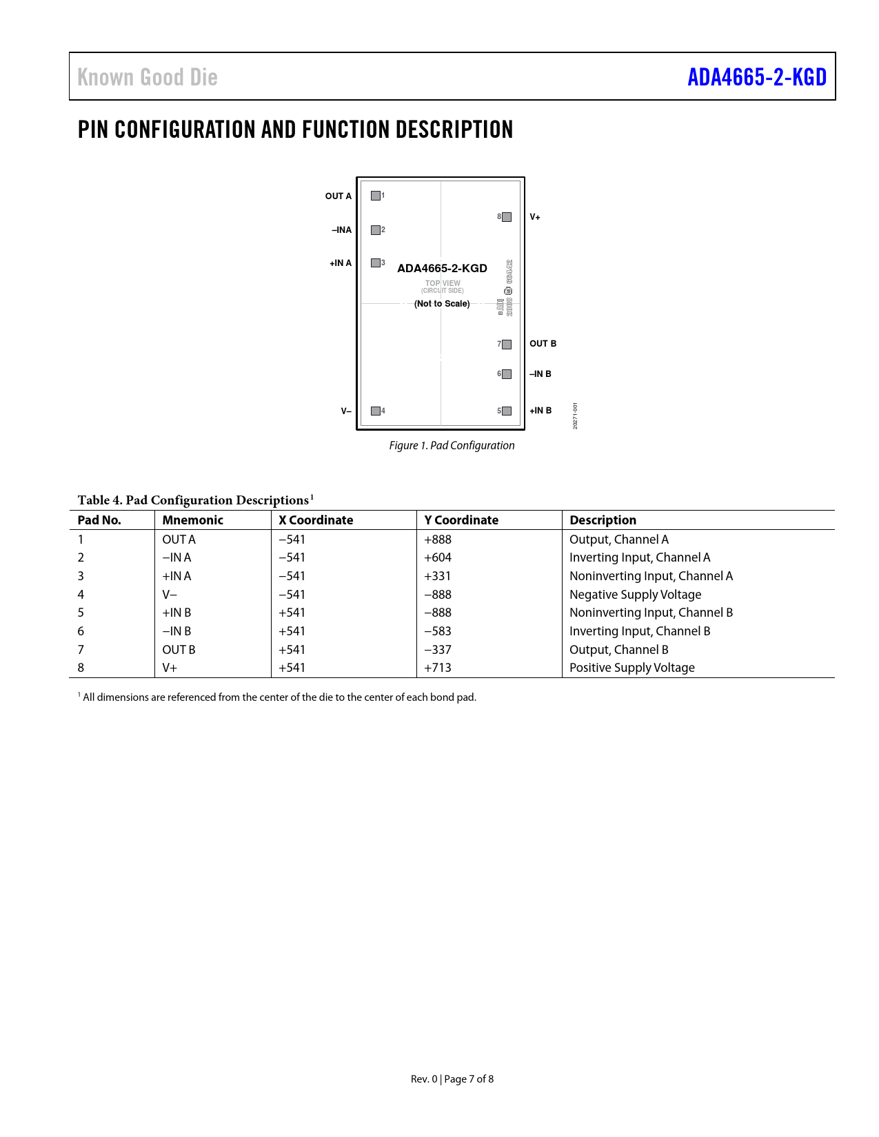Known Good DieADA4665-2-KGDPIN CONFIGURATION AND FUNCTION DESCRIPTIONOUT A18V+–INA2+IN A3ADA4665-2-KGDTOP VIEW(CIRCUIT SIDE)(Not to Scale)7OUT B6–IN BV–45+IN B 001 20271- Figure 1. Pad Configuration Table 4. Pad Configuration Descriptions1 Pad No.MnemonicX CoordinateY CoordinateDescription 1 OUT A −541 +888 Output, Channel A 2 −IN A −541 +604 Inverting Input, Channel A 3 +IN A −541 +331 Noninverting Input, Channel A 4 V− −541 −888 Negative Supply Voltage 5 +IN B +541 −888 Noninverting Input, Channel B 6 −IN B +541 −583 Inverting Input, Channel B 7 OUT B +541 −337 Output, Channel B 8 V+ +541 +713 Positive Supply Voltage 1 All dimensions are referenced from the center of the die to the center of each bond pad. Rev. 0 | Page 7 of 8 Document Outline FEATURES APPLICATIONS GENERAL DESCRIPTION TABLE OF CONTENTS REVISION HISTORY SPECIFICATIONS ELECTRICAL CHARACTERISTICS—16 V OPERATION ELECTRICAL CHARACTERISTICS—5 V OPERATION ABSOLUTE MAXIMUM RATINGS ESD CAUTION PIN CONFIGURATION AND FUNCTION DESCRIPTION OUTLINE DIMENSIONS DIE SPECIFICATIONS AND ASSEMBLY RECOMMENDATIONS ORDERING GUIDE