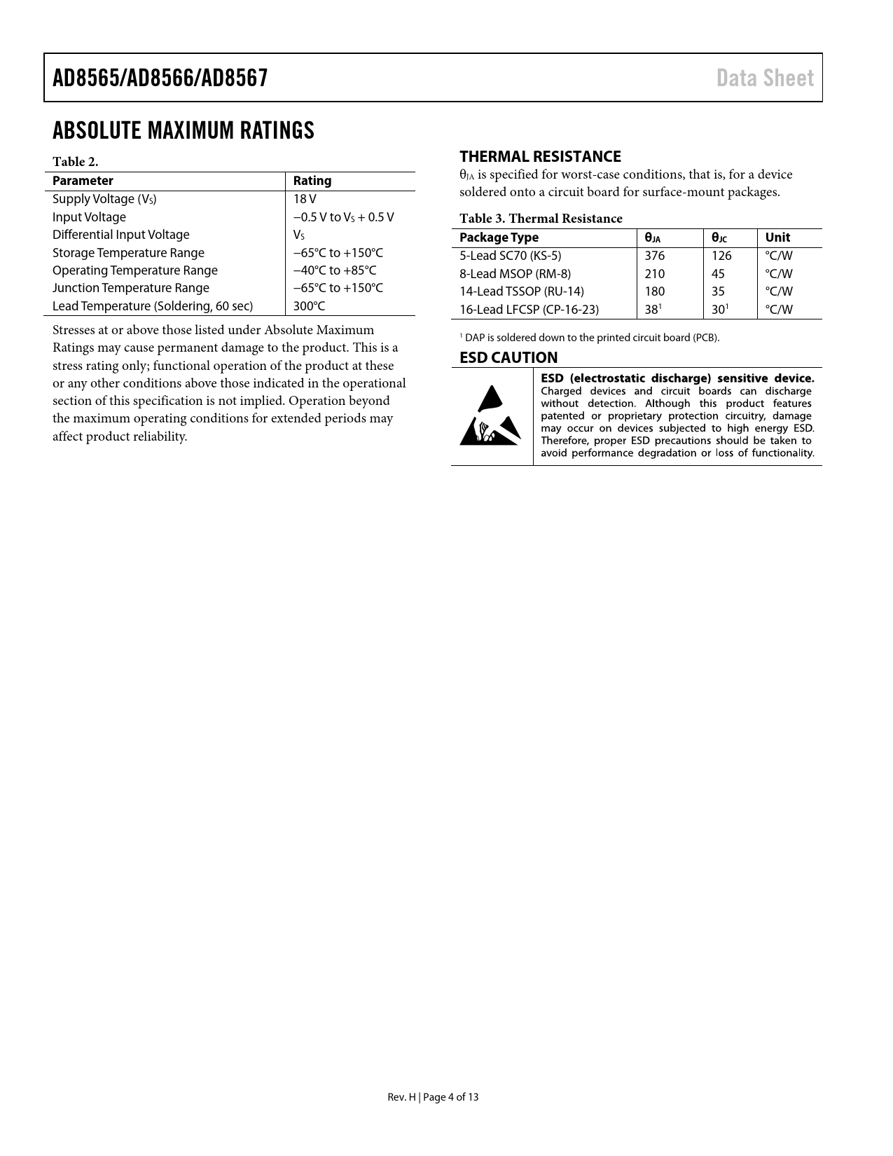 AD8565/AD8566/AD8567. Data Sheet. ABSOLUTE MAXIMUM RATINGS Table 2. THERMAL RESISTANCE. Parameter. Rating