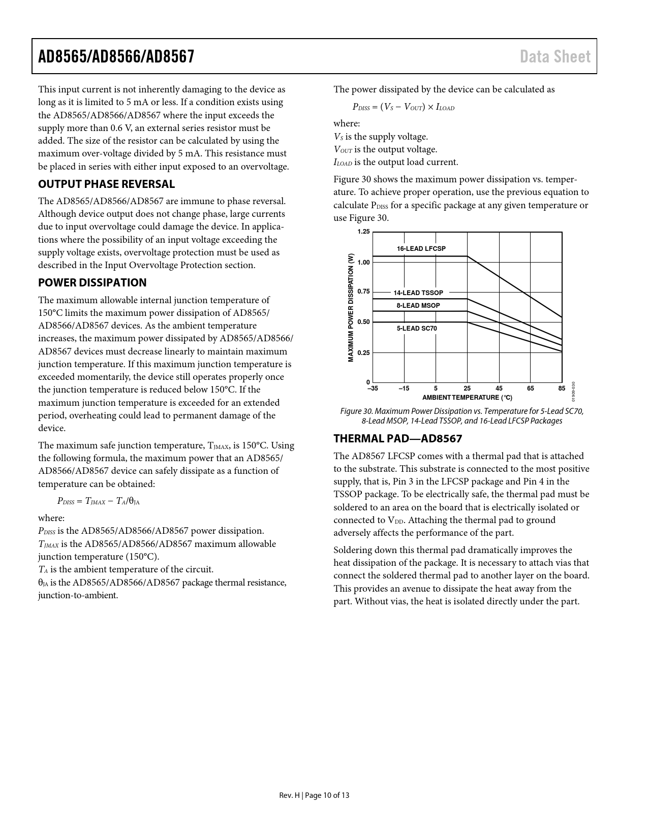 Figure 30 shows the maximum power dissipation vs. temper- ature. To achieve proper operation, use the previous equation to The AD8565/AD8566/AD8567 are immune to phase reversal. calculate PDISS for a specific package at any given temperature or Although device output does not change phase, large currents use Figure 30. due to input overvoltage could damage the device. In applica-