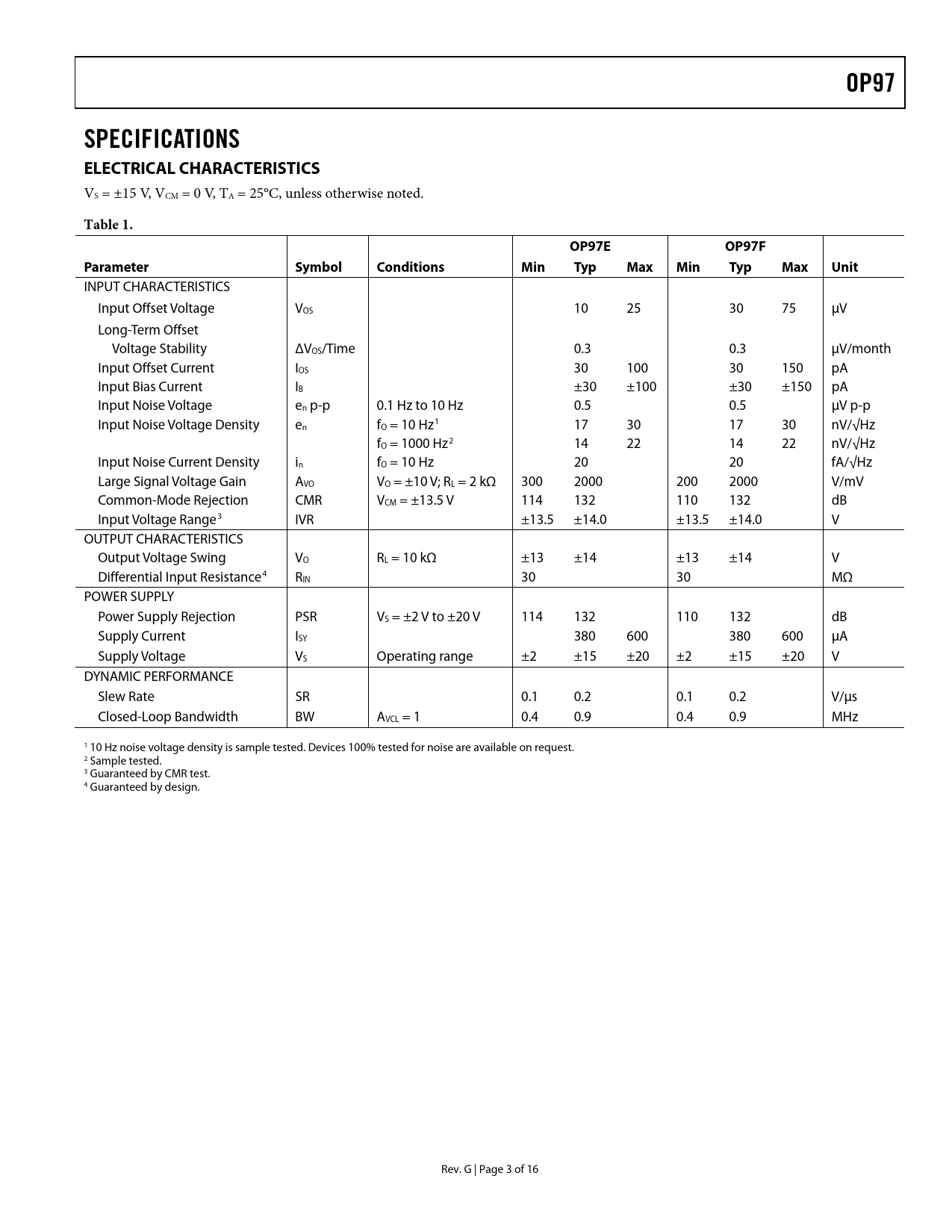 link to page 16 link to page 16 link to page 16 link to page 16 link to page 3 link to page 3 link to page 3 link to page 3 OP97SPECIFICATIONS ELECTRICAL CHARACTERISTICS VS = ±15 V, VCM = 0 V, TA = 25°C, unless otherwise noted. Table 1.OP97EOP97FParameterSymbolConditionsMinTypMaxMinTypMaxUnit INPUT CHARACTERISTICS Input Offset Voltage VOS 10 25 30 75 μV Long-Term Offset Voltage Stability ΔVOS/Time 0.3 0.3 μV/month Input Offset Current IOS 30 100 30 150 pA Input Bias Current IB ±30 ±100 ±30 ±150 pA Input Noise Voltage en p-p 0.1 Hz to 10 Hz 0.5 0.5 μV p-p Input Noise Voltage Density en fO = 10 Hz1 17 30 17 30 nV/√Hz fO = 1000 Hz2 14 22 14 22 nV/√Hz Input Noise Current Density in fO = 10 Hz 20 20 fA/√Hz Large Signal Voltage Gain AVO VO = ±10 V; RL = 2 kΩ 300 2000 200 2000 V/mV Common-Mode Rejection CMR VCM = ±13.5 V 114 132 110 132 dB Input Voltage Range3 IVR ±13.5 ±14.0 ±13.5 ±14.0 V OUTPUT CHARACTERISTICS Output Voltage Swing VO RL = 10 kΩ ±13 ±14 ±13 ±14 V Differential Input Resistance4 RIN 30 30 MΩ POWER SUPPLY Power Supply Rejection PSR VS = ±2 V to ±20 V 114 132 110 132 dB Supply Current ISY 380 600 380 600 μA Supply Voltage VS Operating range ±2 ±15 ±20 ±2 ±15 ±20 V DYNAMIC PERFORMANCE Slew Rate SR 0.1 0.2 0.1 0.2 V/μs Closed-Loop Bandwidth BW AVCL = 1 0.4 0.9 0.4 0.9 MHz 1 10 Hz noise voltage density is sample tested. Devices 100% tested for noise are available on request. 2 Sample tested. 3 Guaranteed by CMR test. 4 Guaranteed by design. Rev. G | Page 3 of 16 Document Outline FEATURES PIN CONNECTIONS GENERAL DESCRIPTION TABLE OF CONTENTS REVISION HISTORY SPECIFICATIONS ELECTRICAL CHARACTERISTICS ABSOLUTE MAXIMUM RATINGS THERMAL RESISTANCE ESD CAUTION TYPICAL PERFORMANCE CHARACTERISTICS APPLICATION INFORMATION AC PERFORMANCE GUARDING AND SHIELDING OUTLINE DIMENSIONS ORDERING GUIDE