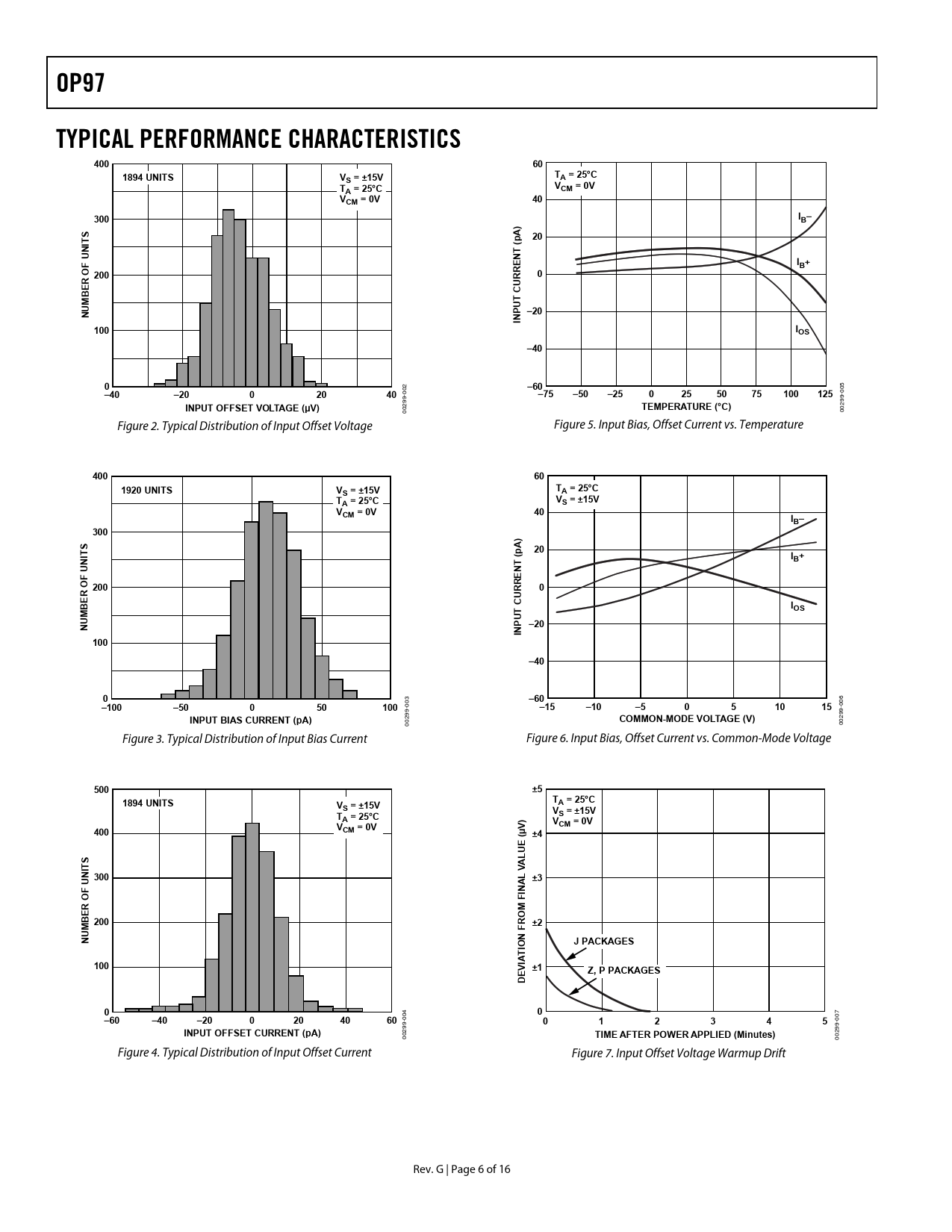 OP97. TYPICAL PERFORMANCE CHARACTERISTICS. 400. 1894 UNITS. S = ±15V. A = 25°C. CM = 0V. VCM = 0V. 300. IB–. NI U. IB+. O 200. R E B. CUR. T U. –20. INP