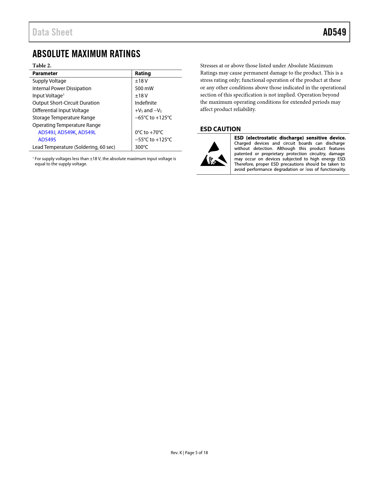 Data Sheet AD549 ABSOLUTE MAXIMUM RATINGS Table 2 Parameter Rating ESD CAUTION