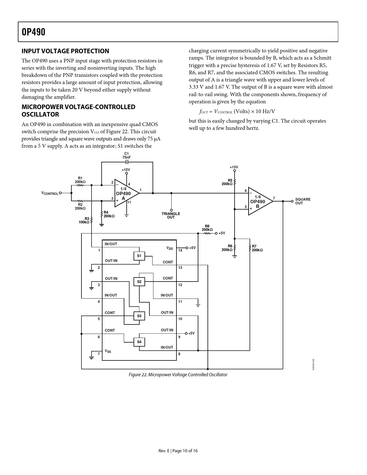 OP490. INPUT VOLTAGE PROTECTION. MICROPOWER VOLTAGE-CONTROLLED. OSCILLATOR. 75nF. +15V. 200kΩ. 2 –. 1/4. 6 –. VCONTROL. 3 + A. SQUARE OUT. 5 +