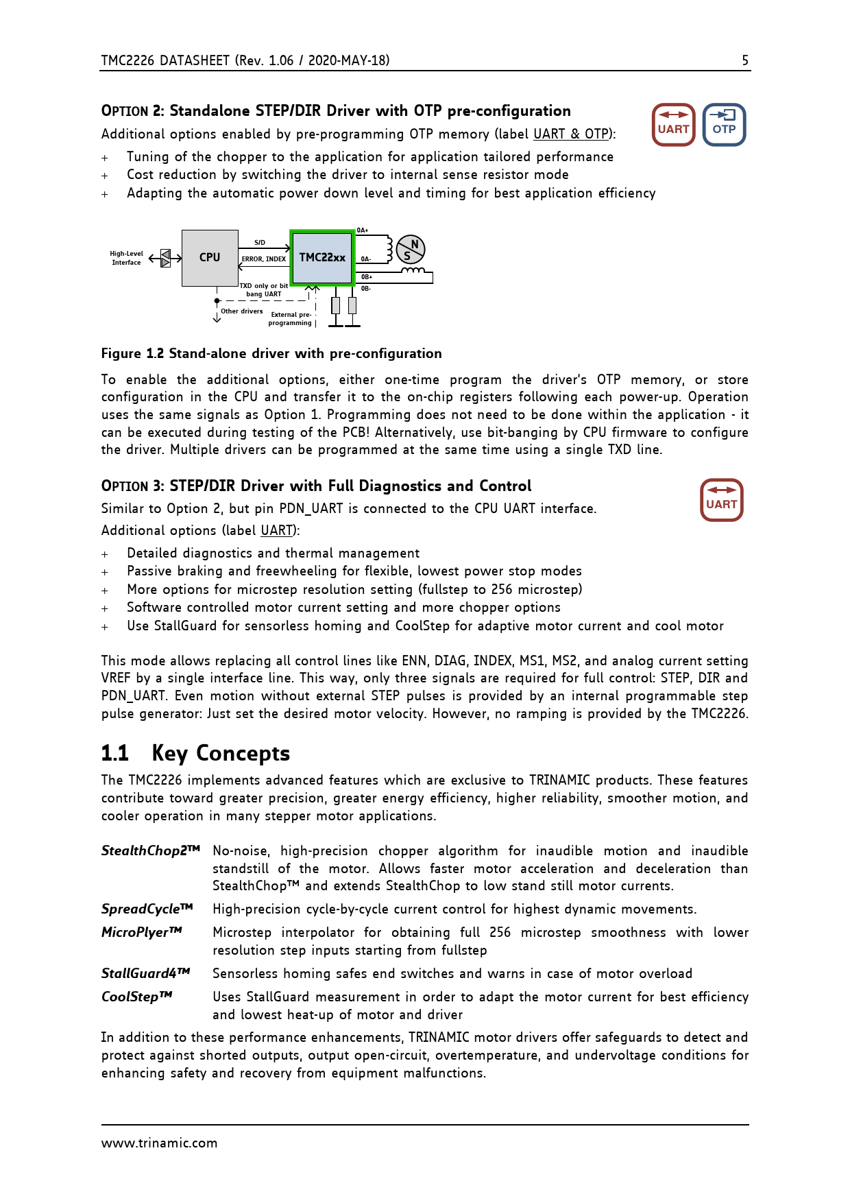 TMC2226 DATASHEET (Rev. 1.06 / 2020-MAY-18) 5 OPTION 2: Standalone STEP/DIR Driver with OTP pre-configuration Additional options enabled by pre-programming OTP memory (label UART & OTP): UARTOTP + Tuning of the chopper to the application for application tailored performance + Cost reduction by switching the driver to internal sense resistor mode + Adapting the automatic power down level and timing for best application efficiency 0A+S/DNHigh-LevelCPUERROR, INDEXTMC22xx0A-SInterface0B+TXD only or bit0B-bang UARTOther driversExternal pre-programmingFigure 1.2 Stand-alone driver with pre-configuration To enable the additional options, either one-time program the driver’s OTP memory, or store configuration in the CPU and transfer it to the on-chip registers following each power-up. Operation uses the same signals as Option 1. Programming does not need to be done within the application - it can be executed during testing of the PCB! Alternatively, use bit-banging by CPU firmware to configure the driver. Multiple drivers can be programmed at the same time using a single TXD line. OPTION 3: STEP/DIR Driver with Full Diagnostics and Control Similar to Option 2, but pin PDN_UART is connected to the CPU UART interface. UART Additional options (label UART): + Detailed diagnostics and thermal management + Passive braking and freewheeling for flexible, lowest power stop modes + More options for microstep resolution setting (fullstep to 256 microstep) + Software controlled motor current setting and more chopper options + Use StallGuard for sensorless homing and CoolStep for adaptive motor current and cool motor This mode allows replacing all control lines like ENN, DIAG, INDEX, MS1, MS2, and analog current setting VREF by a single interface line. This way, only three signals are required for full control: STEP, DIR and PDN_UART. Even motion without external STEP pulses is provided by an internal programmable step pulse generator: Just set the desired motor velocity. However, no ramping is provided by the TMC2226. 1.1 Key Concepts The TMC2226 implements advanced features which are exclusive to TRINAMIC products. These features contribute toward greater precision, greater energy efficiency, higher reliability, smoother motion, and cooler operation in many stepper motor applications. StealthChop2™ No-noise, high-precision chopper algorithm for inaudible motion and inaudible standstill of the motor. Allows faster motor acceleration and deceleration than StealthChop™ and extends StealthChop to low stand still motor currents. SpreadCycle™ High-precision cycle-by-cycle current control for highest dynamic movements. MicroPlyer™ Microstep interpolator for obtaining full 256 microstep smoothness with lower resolution step inputs starting from fullstep StallGuard4™ Sensorless homing safes end switches and warns in case of motor overload CoolStep™ Uses StallGuard measurement in order to adapt the motor current for best efficiency and lowest heat-up of motor and driver In addition to these performance enhancements, TRINAMIC motor drivers offer safeguards to detect and protect against shorted outputs, output open-circuit, overtemperature, and undervoltage conditions for enhancing safety and recovery from equipment malfunctions. www.trinamic.com