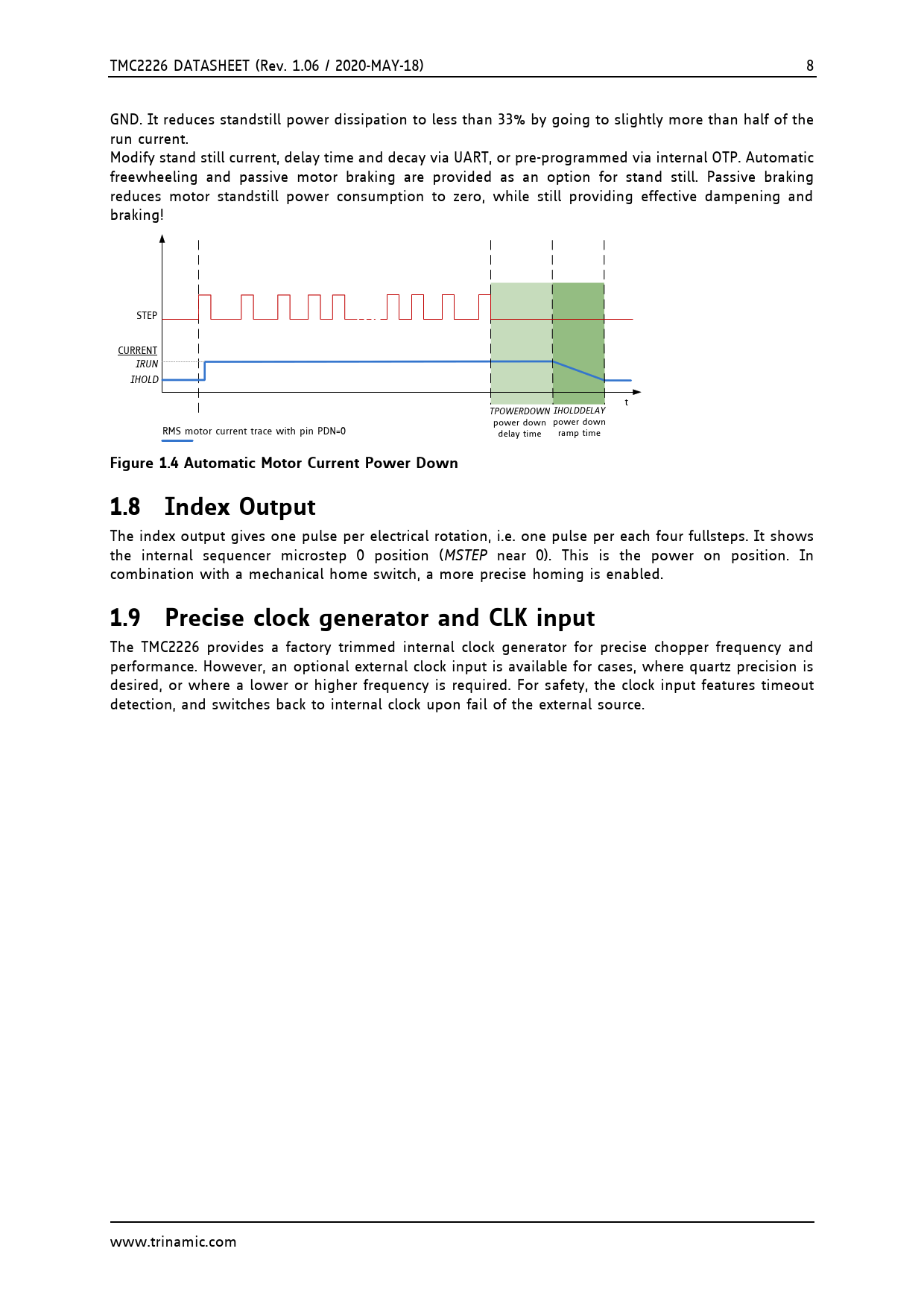 TMC2226 DATASHEET (Rev. 1.06 / 2020-MAY-18) 8 GND. It reduces standstill power dissipation to less than 33% by going to slightly more than half of the run current. Modify stand still current, delay time and decay via UART, or pre-programmed via internal OTP. Automatic freewheeling and passive motor braking are provided as an option for stand still. Passive braking reduces motor standstill power consumption to zero, while still providing effective dampening and braking! STEP CURRENT IRUN IHOLD t TPOWERDOWN IHOLDDELAY power down power down RMS motor current trace with pin PDN=0 delay time ramp time Figure 1.4 Automatic Motor Current Power Down1.8 Index Output The index output gives one pulse per electrical rotation, i.e. one pulse per each four fullsteps. It shows the internal sequencer microstep 0 position (MSTEP near 0). This is the power on position. In combination with a mechanical home switch, a more precise homing is enabled. 1.9 Precise clock generator and CLK input The TMC2226 provides a factory trimmed internal clock generator for precise chopper frequency and performance. However, an optional external clock input is available for cases, where quartz precision is desired, or where a lower or higher frequency is required. For safety, the clock input features timeout detection, and switches back to internal clock upon fail of the external source. www.trinamic.com