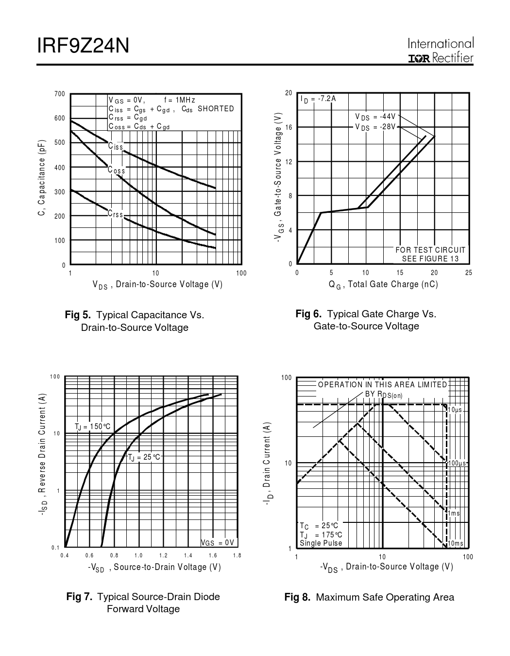 IRF9Z24N 700 20 I = -7.2 A V G S = 0V , f = 1M H z D C is = s C gs + C g d , C ds S H OR TE D ) 600 C rs = s C g d V V = -4 4V DS C o = s s C ds + C gd 16 V = -2 8V DS ) 500 ltage ( F C is s o p V e ( e 12 c 400 C o s s itanc our -S pac 300 a -to 8 te , C a C 200 C rs s , G GS 4 100 -V FO R TEST C IR C U IT SEE F IGU R E 1 3 0 0 A A 1 10 100 0 5 10 15 20 25 V , Drai n-to -So urce V oltag e (V) Q D S G , Tota l Gate Ch arge (n C)