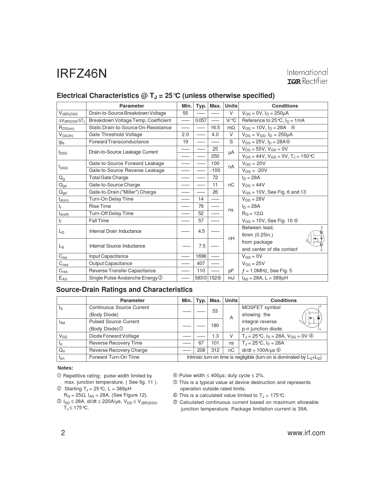 V(BR)DSS Drain-to-Source Breakdown Voltage 55 ––– ––– V VGS = 0V, ID = 250µA ∆V(BR)DSS/∆TJ Breakdown Voltage Temp. Coefficient ––– 0.057 ––– V/°C Reference to 25°C, ID = 1mA RDS(on) Static Drain-to-Source On-Resistance ––– ––– 16.5 mΩ VGS = 10V, ID = 28A VGS(th) Gate Threshold Voltage 2.0 ––– 4.0 V VDS = VGS, ID = 250µA gfs Forward Transconductance 19 ––– ––– S VDS = 25V, ID = 28A ––– ––– 25 V IDSS Drain-to-Source Leakage Current µA DS = 55V, VGS = 0V ––– ––– 250 VDS = 44V, VGS = 0V, TJ = 150°C Gate-to-Source Forward Leakage ––– ––– 100 VGS = 20V IGSS nA Gate-to-Source Reverse Leakage ––– ––– -100 VGS = -20V Qg Total Gate Charge ––– ––– 72 ID = 28A Qgs Gate-to-Source Charge ––– ––– 11 nC VDS = 44V Qgd Gate-to-Drain ("Miller") Charge ––– ––– 26 VGS = 10V, See Fig. 6 and 13 td(on) Turn-On Delay Time ––– 14 ––– VDD = 28V tr Rise Time ––– 76 ––– ID = 28A ns td(off) Turn-Off Delay Time ––– 52 ––– RG = 12Ω tf Fall Time ––– 57 ––– VGS = 10V, See Fig. 10 Between lead, D LD Internal Drain Inductance ––– 4.5 ––– 6mm (0.25in.) nH from package G LS Internal Source Inductance ––– 7.5 ––– and center of die contact S Ciss Input Capacitance ––– 1696 ––– VGS = 0V Coss Output Capacitance ––– 407 ––– VDS = 25V Crss Reverse Transfer Capacitance ––– 110 ––– pF ƒ = 1.0MHz, See Fig. 5 EAS Single Pulse Avalanche Energy ––– 583