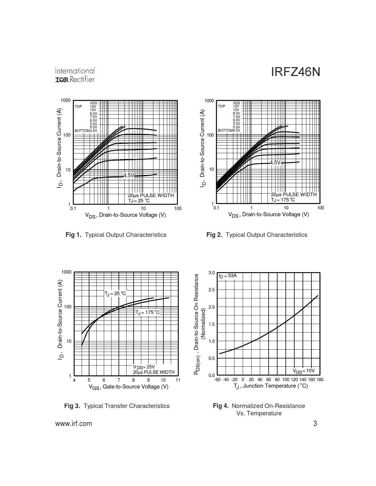 IRFZ46N 1000 1000 VGS VGS TOP 15V ) TOP 15V 10V ) 10V 8.0V A 8.0V t (A 7.0V 7.0V n t ( 6.0V 6.0V n 5.5V 5.5V rre 5.0V 5.0V u rre BOTTOM4.5V BOTTOM4.5V u C 100 100 e C e rc u rc o u o -S -S -to -to 4.5V in in 10 ra 10 ra 4.5V I , D D I , D D 20µs PULSE WIDTH 20µs PULSE WIDTH T = J 25 C ° T = 175 J C ° 1 1 0.1 1 10 100 0.1 1 10 100 V , Drain-to-Source Voltage (V) V , Drain-to-Source Voltage (V) DS DS Fig 1. Typical Output Characteristics Fig 2. Typical Output Characteristics 1000 3.0 e ID = 53A ) c n ta t (A n is 2.5 T = 25 C s J ° e rre u R n C 100 2.0 e T = 175 C O rc J ° e ed) u rc o u liz o a 1.5 -S -S m -to or in -to (N 10 in ra 1.0 ra I , D D 0.5 (on) V = DS 25V S , DD 20µs PULSE WIDTH R V = GS 10V 1 0.0 4 5 6 7 8 9 10 11 -60 -40 -20 0 20 40 60 80 100 120 140 160 180 V , Gate-to-Source Voltage (V) T , Junction Temperature ( C ° ) GS J Fig 3. Typical Transfer Characteristics Fig 4. Normalized On-Resistance Vs. Temperature www.irf.com 3