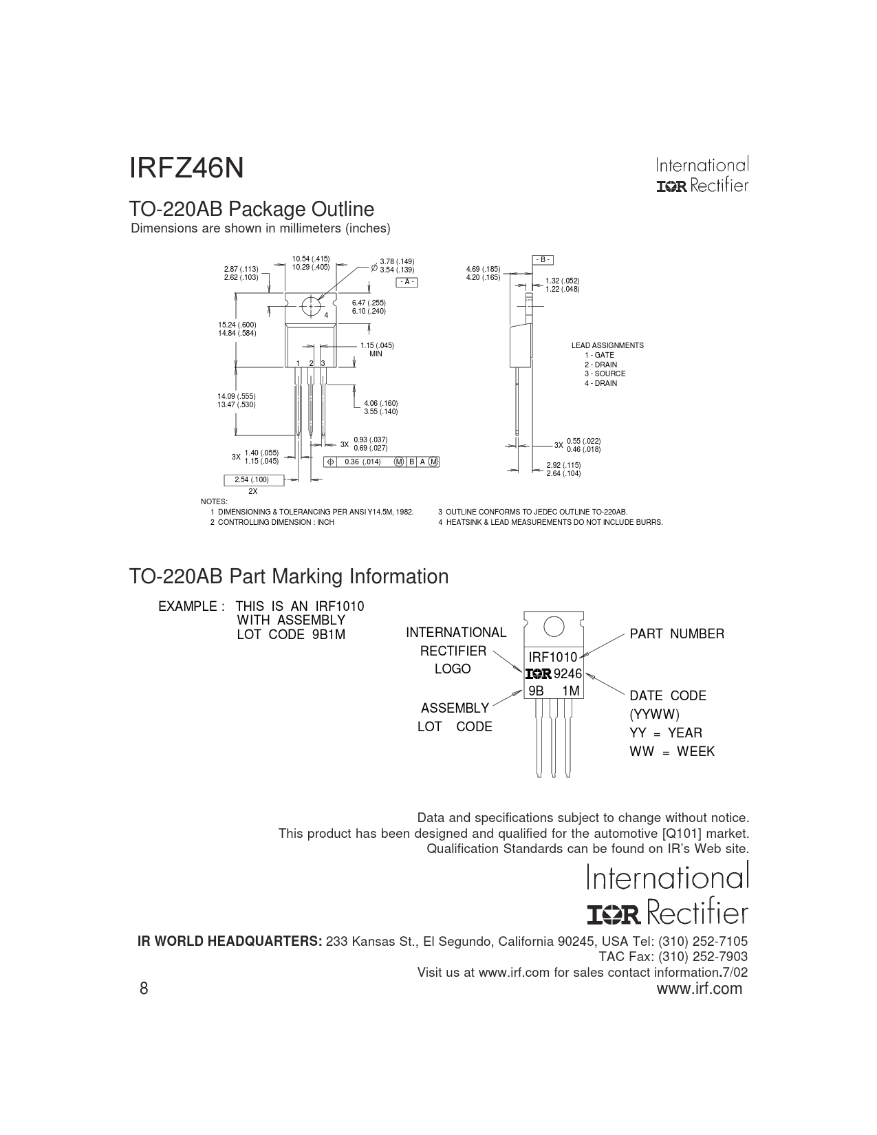 IRFZ46N TO-220AB Package Outline Dimensions are shown in millimeters (inches) 10.54 (.415) - B - 3.78 (.149) 10.29 (.405) 2.87 (.113) 3.54 (.139) 4.69 (.185) 2.62 (.103) 4.20 (.165) - A - 1.32 (.052) 1.22 (.048) 6.47 (.255) 6.10 (.240) 4 15.24 (.600) 14.84 (.584) 1.15 (.045) LEAD ASSIGNMENTS MIN 1 - GATE 1 2 3 2 - DRAIN 3 - SOURCE 4 - DRAIN 14.09 (.555) 4.06 (.160) 13.47 (.530) 3.55 (.140) 0.93 (.037) 0.55 (.022) 3X 3X 0.69 (.027) 0.46 (.018) 1.40 (.055) 3X 1.15 (.045) 0.36 (.014) M B A M 2.92 (.115) 2.64 (.104) 2.54 (.100) 2X NOTES: 1 DIMENSIONING & TOLERANCING PER ANSI Y14.5M, 1982. 3 OUTLINE CONFORMS TO JEDEC OUTLINE TO-220AB. 2 CONTROLLING DIMENSION : INCH 4 HEATSINK & LEAD MEASUREMENTS DO NOT INCLUDE BURRS. TO-220AB Part Marking Information EXAMPLE : THIS IS AN IRF1010 WITH ASSEMBLY A INTERNATIONAL LOT CODE 9B1M PART NUMBER RECTIFIER IRF1010 LOGO 9246 9B 1M DATE CODE ASSEMBLY (YYWW) LOT CODE YY = YEAR WW = WEEK Data and specifications subject to change without notice. This product has been designed and qualified for the automotive [Q101] market. Qualification Standards can be found on IR’s Web site. IR WORLD HEADQUARTERS: 233 Kansas St., El Segundo, California 90245, USA Tel: (310) 252-7105 TAC Fax: (310) 252-7903 Visit us at www.irf.com for sales contact information . 7/02 8 www.irf.com