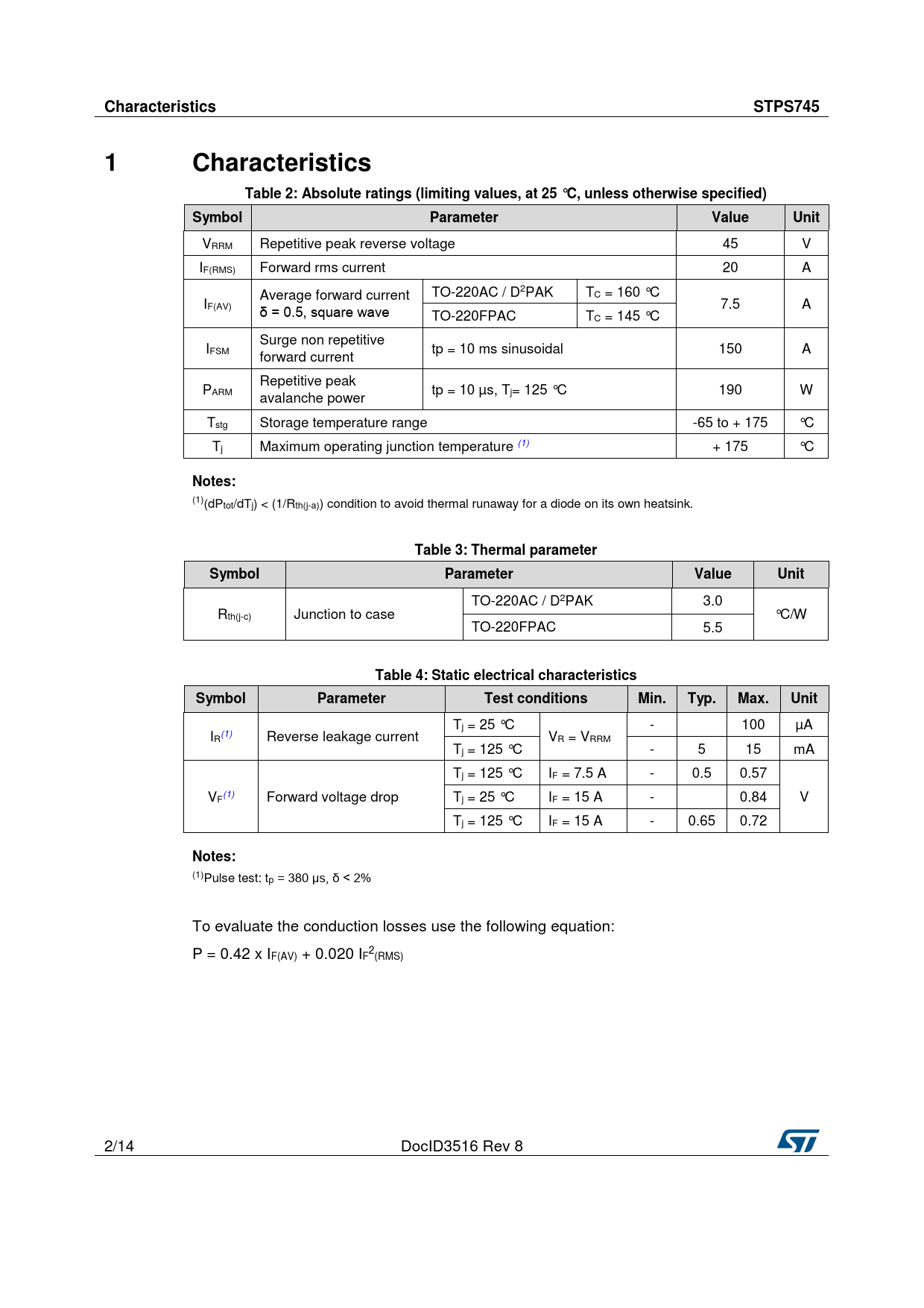 Characteristics STPS745 1 Characteristics Table 2: Absolute ratings (limiting values, at 25 °C, unless otherwise specified) Symbol Parameter Value Unit