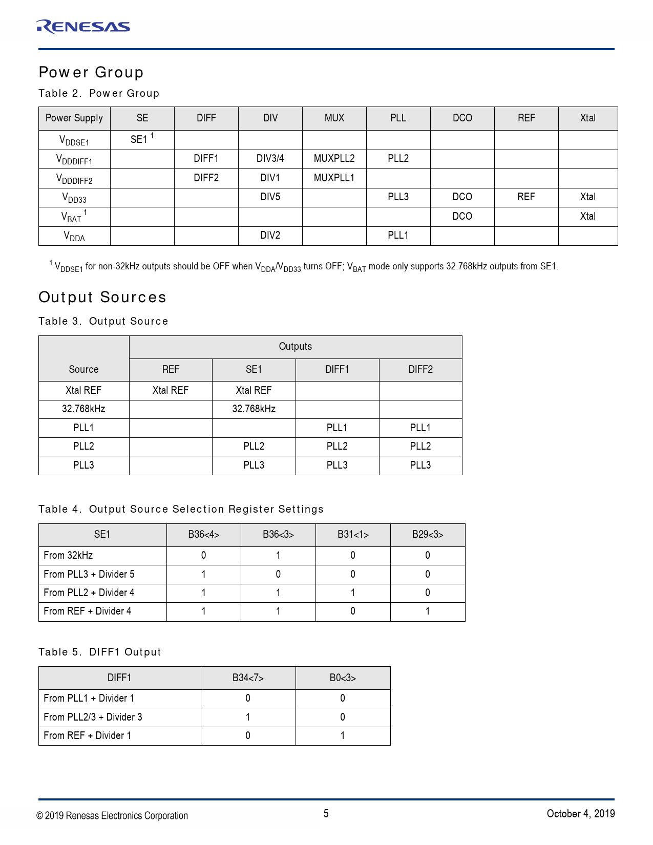 Power Group Table 2. Power Group. Power Supply. DIFF. DIV. MUX. PLL. DCO. REF. Xtal. Output Sources Table 3. Output Source. Outputs. Source
