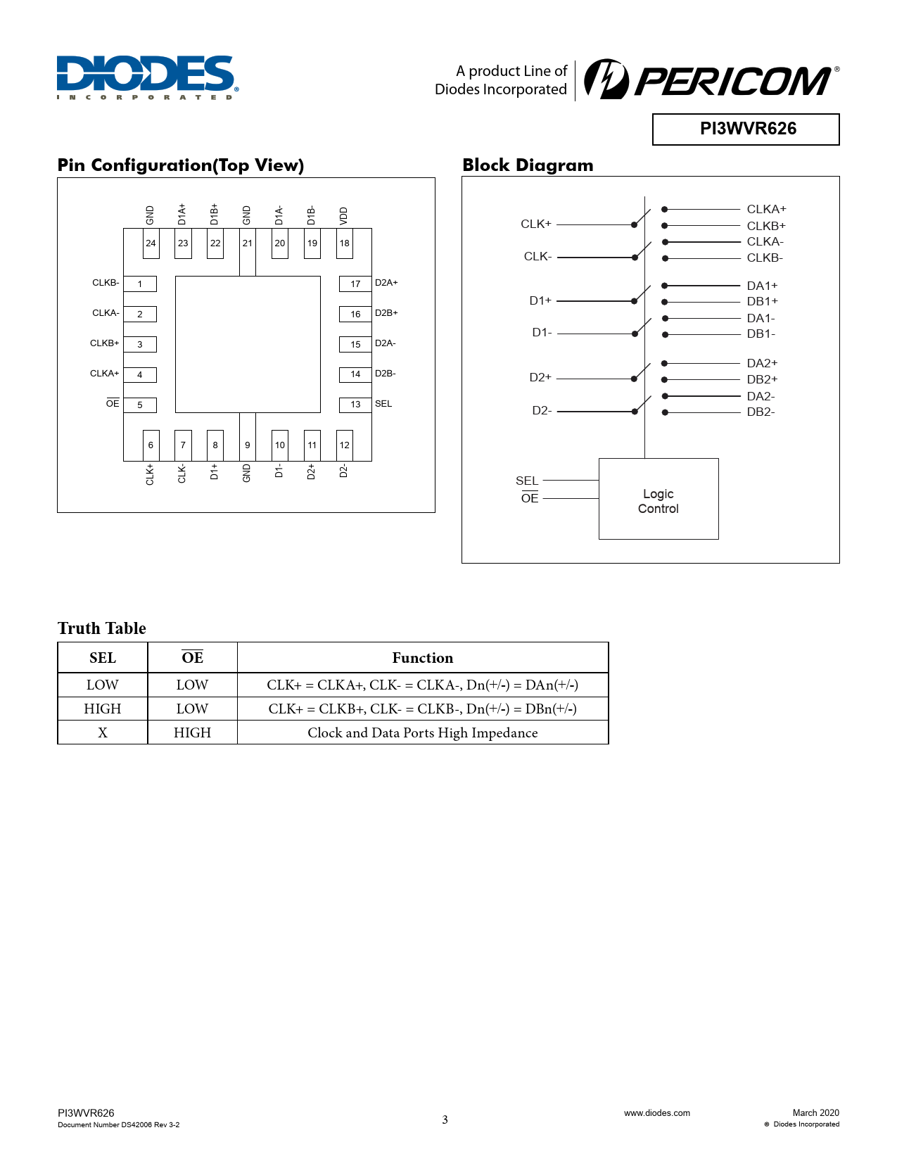 PI3WVR626. Pin Configuration(Top View). Block Diagram. Truth Table. SEL. Function