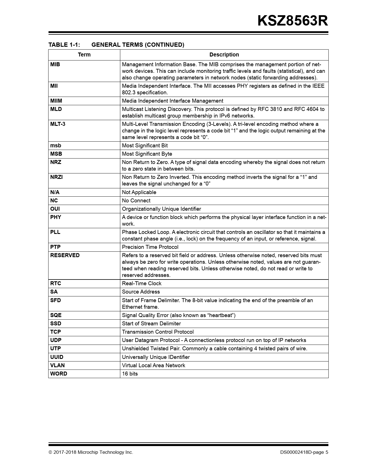 KSZ8563R. TABLE 1-1:. GENERAL TERMS (CONTINUED). Term. Description. MIB. MII. MIIM. MLD. MLT-3. msb. MSB. NRZ. NRZI. N/A. OUI. PHY. PLL. PTP. RESERVED. RTC. SFD