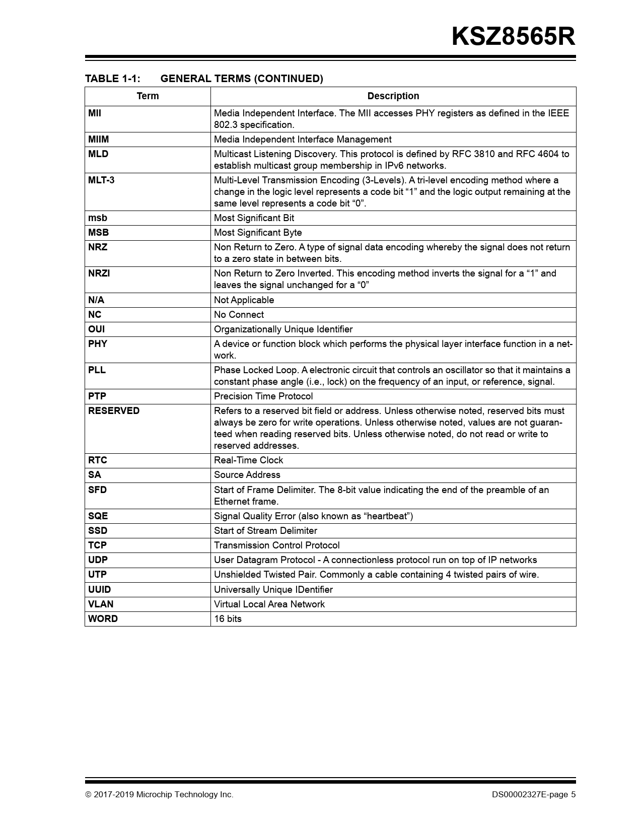 KSZ8565RTABLE 1-1:GENERAL TERMS (CONTINUED)TermDescriptionMII Media Independent Interface. The MII accesses PHY registers as defined in the IEEE 802.3 specification. MIIM Media Independent Interface Management MLD Multicast Listening Discovery. This protocol is defined by RFC 3810 and RFC 4604 to establish multicast group membership in IPv6 networks. MLT-3 Multi-Level Transmission Encoding (3-Levels). A tri-level encoding method where a change in the logic level represents a code bit “1” and the logic output remaining at the same level represents a code bit “0”. msb Most Significant Bit MSB Most Significant Byte NRZ Non Return to Zero. A type of signal data encoding whereby the signal does not return to a zero state in between bits. NRZI Non Return to Zero Inverted. This encoding method inverts the signal for a “1” and leaves the signal unchanged for a “0” N/A Not Applicable NC No Connect OUI Organizationally Unique Identifier PHY A device or function block which performs the physical layer interface function in a net- work. PLL Phase Locked Loop. A electronic circuit that controls an oscillator so that it maintains a constant phase angle (i.e., lock) on the frequency of an input, or reference, signal. PTP Precision Time Protocol RESERVED Refers to a reserved bit field or address. Unless otherwise noted, reserved bits must always be zero for write operations. Unless otherwise noted, values are not guaran- teed when reading reserved bits. Unless otherwise noted, do not read or write to reserved addresses. RTC Real-Time Clock SA Source Address SFD Start of Frame Delimiter. The 8-bit value indicating the end of the preamble of an Ethernet frame. SQE Signal Quality Error (also known as “heartbeat”) SSD Start of Stream Delimiter TCP Transmission Control Protocol UDP User Datagram Protocol - A connectionless protocol run on top of IP networks UTP Unshielded Twisted Pair. Commonly a cable containing 4 twisted pairs of wire. UUID Universally Unique IDentifier VLAN Virtual Local Area Network WORD 16 bits 2017-2019 Microchip Technology Inc. DS00002327E-page 5 Document Outline 1.0 Preface 1.1 Glossary of Terms TABLE 1-1: General Terms 1.2 Buffer Types TABLE 1-2: Buffer Types 1.3 Register Nomenclature TABLE 1-3: Register Nomenclature 1.4 References 2.0 Introduction 2.1 General Description FIGURE 2-1: Internal Block Diagram 3.0 Pin Descriptions and Configuration 3.1 Pin Assignments FIGURE 3-1: Pin Assignments (Top View) TABLE 3-1: Pin Assignments 3.2 Pin Descriptions TABLE 3-2: Pin Descriptions 3.2.1 Configuration Straps TABLE 3-3: Configuration Strap Descriptions 4.0 Functional Description 4.1 Physical Layer Transceiver (PHY) 4.1.1 100BASE-TX Transceiver 4.1.2 10BASE-T/Te Transceiver 4.1.3 Auto MDI/MDI-X TABLE 4-1: MDI/MDI-X Pin Definitions 4.1.4 Wave Shaping, Slew-Rate Control, and Partial Response 4.1.5 Auto-Negotiation FIGURE 4-1: Auto-Negotiation and Parallel Operation 4.1.6 Quiet-WIRE Filtering TABLE 4-2: Enabling and Disabling Quiet-WIRE 4.1.7 Fast Link-Up 4.1.8 LinkMD®+ Enhanced Diagnostics: Receive Signal Quality Indicator 4.1.9 Remote PHY Loopback FIGURE 4-2: Remote PHY Loopback 4.2 LEDs 4.2.1 Single-LED Mode TABLE 4-3: Single-LED Mode Pin Definition 4.2.2 Tri-Color Dual-LED Mode TABLE 4-4: Tri-Color Dual-LED Mode Pin Definition 4.3 Media Access Controller (MAC) 4.3.1 MAC Operation 4.3.2 Inter-Packet Gap (IPG) 4.3.3 Back-Off Algorithm 4.3.4 Late Collision 4.3.5 Legal Packet Size 4.3.6 Flow Control 4.3.7 Half-Duplex Back Pressure 4.3.8 Flow Control and Back Pressure Registers TABLE 4-5: Flow Control and back Pressure Registers 4.3.9 Broadcast Storm Protection 4.3.10 Self-Address Filtering 4.4 Switch 4.4.1 Switching Engine 4.4.2 Address Lookup TABLE 4-6: Address Lookup Table Hashing Options TABLE 4-7: Reserved Multicast Address Table FIGURE 4-3: Packet Forwarding Process Flowchart TABLE 4-8: Lookup Engine Registers 4.4.3 IEEE 802.1Q VLAN TABLE 4-9: VLAN Forwarding TABLE 4-10: Hashed(DA) + FID Lookup in VLAN Mode TABLE 4-11: Hashed(SA) + FID Lookup in VLAN Mode TABLE 4-12: VLAN Registers 4.4.4 Quality-of-Service (QoS) Priority Support FIGURE 4-4: 802.p Priority Field Format 4.4.5 Traffic Conditioning & Policing 4.4.6 Spanning Tree Support TABLE 4-13: Spanning Tree States 4.4.7 Rapid Spanning Tree Support 4.4.8 Multiple Spanning Tree Support 4.4.9 Tail Tagging Mode FIGURE 4-5: Tail Tag Frame Format TABLE 4-14: Receive Tail Tag Format (from Switch to Host) TABLE 4-15: Transmit Tail Tag Format (from Host to Switch) FIGURE 4-6: PTP Mode Tail Tag Frame Format 4.4.10 IGMP Support 4.4.11 IPv6 MLD Snooping 4.4.12 Port Mirroring 4.4.13 Scheduling and Rate Limiting 4.4.14 Egress Traffic Shaping 4.4.15 Low Latency Cut-Through Mode 4.4.16 Ingress MAC Address Filtering Function 4.4.17 802.1X Access Control 4.4.18 Access Control List (ACL) Filtering TABLE 4-16: ACL Processing Entry Parameters FIGURE 4-7: ACL Structure and Example Rule Values TABLE 4-17: Matching Rule Options TABLE 4-18: ACL Matching Rule Parameters for MD = 01 TABLE 4-19: ACL Matching Rule Parameters for MD = 10 TABLE 4-20: ACL Matching Rule Parameters for MD = 11 TABLE 4-21: ACL Action Rule Parameters for Non-count Modes (MD ≠ 01 or ENB ≠ 00) TABLE 4-22: ACL Action Rule Parameters for count Mode (MD = 01 or ENB = 00) FIGURE 4-8: ACL Table Format TABLE 4-23: ACL Registers 4.5 IEEE 1588 Precision Time Protocol 4.5.1 IEEE 1588 PTP System Time Clock FIGURE 4-9: PTP System Clock Overview 4.5.2 IEEE 1588 PTP Messaging Processing 4.5.3 IEEE 1588 PTP Event Triggering and Timestamping 4.6 Audio Video Bridging and Time Sensitive Networks 4.7 NAND Tree Support TABLE 4-24: NAND Tree Test Pin Order 4.8 Clocking 4.8.1 Primary Clock 4.8.2 MAC Interface Clocks 4.8.3 Serial Management Interface Clock 4.8.4 Synchronous Ethernet and SYNCLKO 4.9 Power FIGURE 4-10: Power Connection Diagram 4.10 Power Management TABLE 4-25: MDI/MDI-X Pin Definitions 4.10.1 Normal Operation Mode 4.10.2 Energy-Detect Mode 4.10.3 Global Soft Power-Down Mod