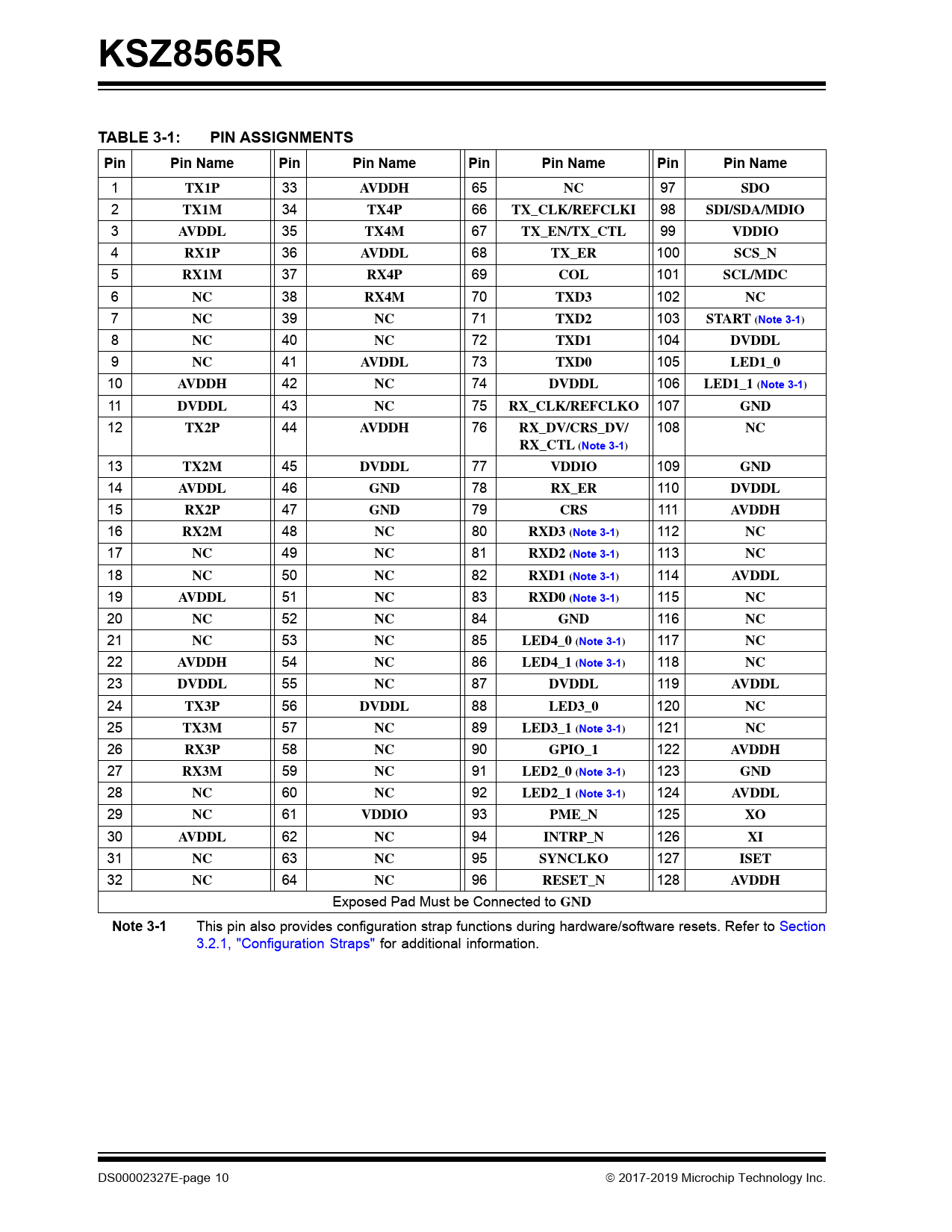 | Pages / Page | 239 / 10 — KSZ8565R. TABLE 3-1:. PIN ASSIGNMENTS. Pin. Pin Name. TX1P. AVDDH. SDO. … |