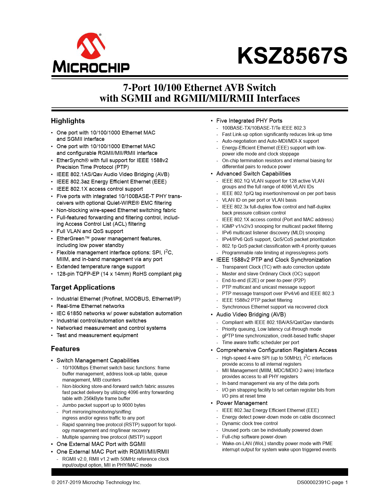 KSZ8567S. 7-Port 10/100 Ethernet AVB Switch. with SGMII and RGMII/MII/RMII Interfaces. Highlights. Target Applications. Features