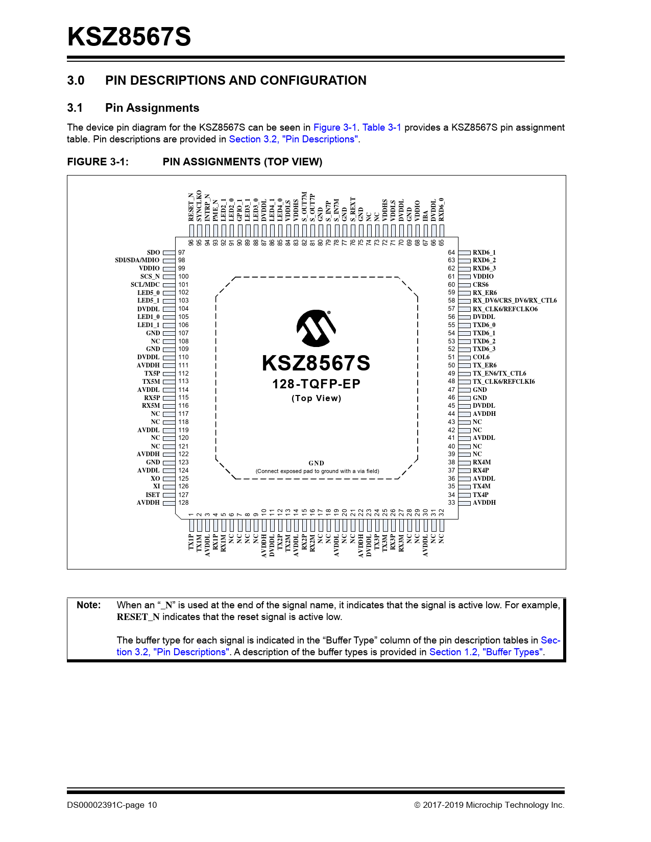 The device pin diagram for the KSZ8567S can be seen in Figure 3-1. Table 3-1 provides a KSZ8567S pin assignment table. Pin descriptions are provided in Section 3.2, "Pin Descriptions".